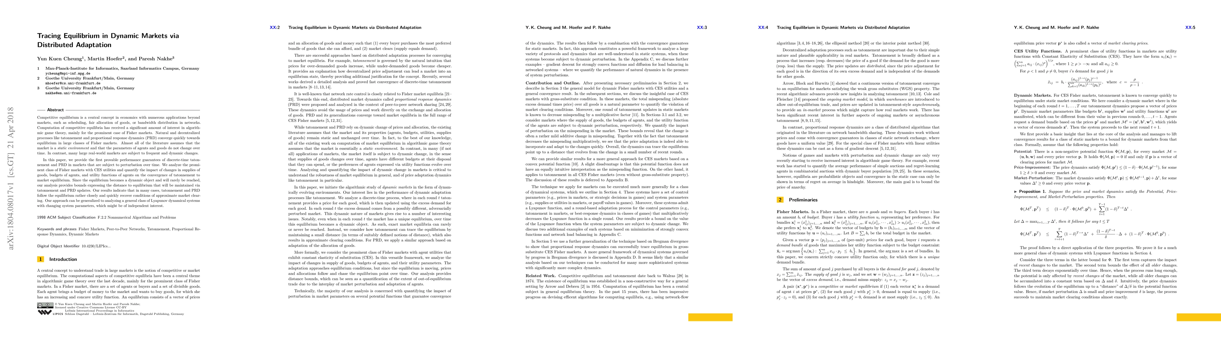 This paper investigates the performance of decentralized adaptation processes like tatonnement and proportional response dynamics in dynamic markets, providing the first provable guarantees for their convergence in markets with changing parameters over time. The study focuses on Fisher markets with CES utilities, analyzing how variations in goods supplies, budgets, and utility functions affect equilibrium convergence, and offers bounds on the maintained distance to equilibrium.