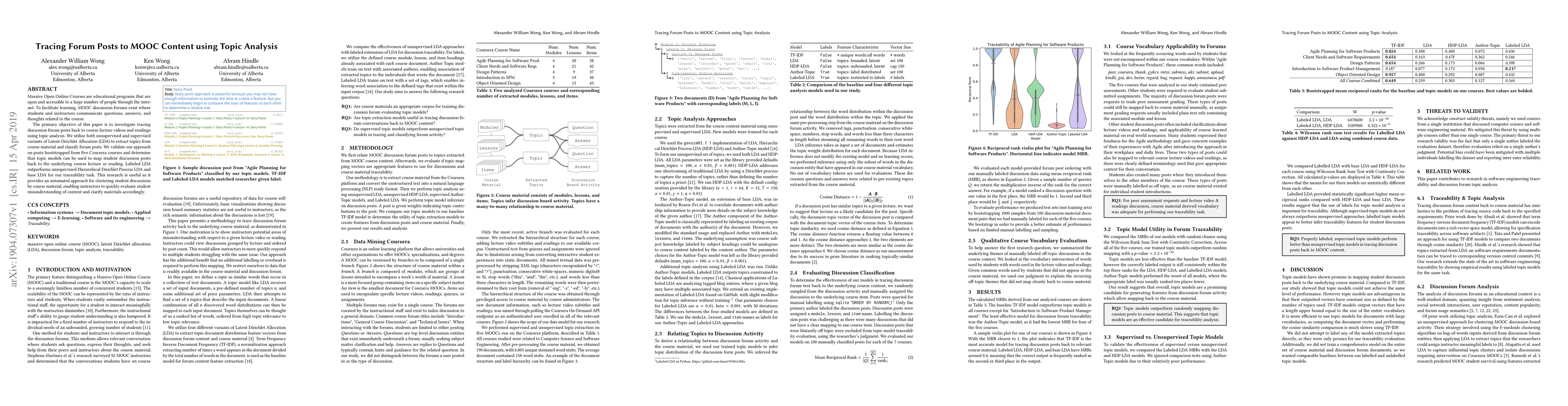 Massive Open Online Courses are educational programs that are open and accessible to a large number of people through the internet. To facilitate learning, MOOC discussion forums exist where students and instructors communicate questions, answers, and thoughts related to the course. The primary objective of this paper is to investigate tracing discussion forum posts back to course lecture videos and readings using topic analysis. We utilize both unsupervised and supervised variants of Latent Dirichlet Allocation (LDA) to extract topics from course material and classify forum posts. We validate our approach on posts bootstrapped from five Coursera courses and determine that topic models can be used to map student discussion posts back to the underlying course lecture or reading. Labeled LDA outperforms unsupervised Hierarchical Dirichlet Process LDA and base LDA for our traceability task. This research is useful as it provides an automated approach for clustering student discussions by course material, enabling instructors to quickly evaluate student misunderstanding of content and clarify materials accordingly.