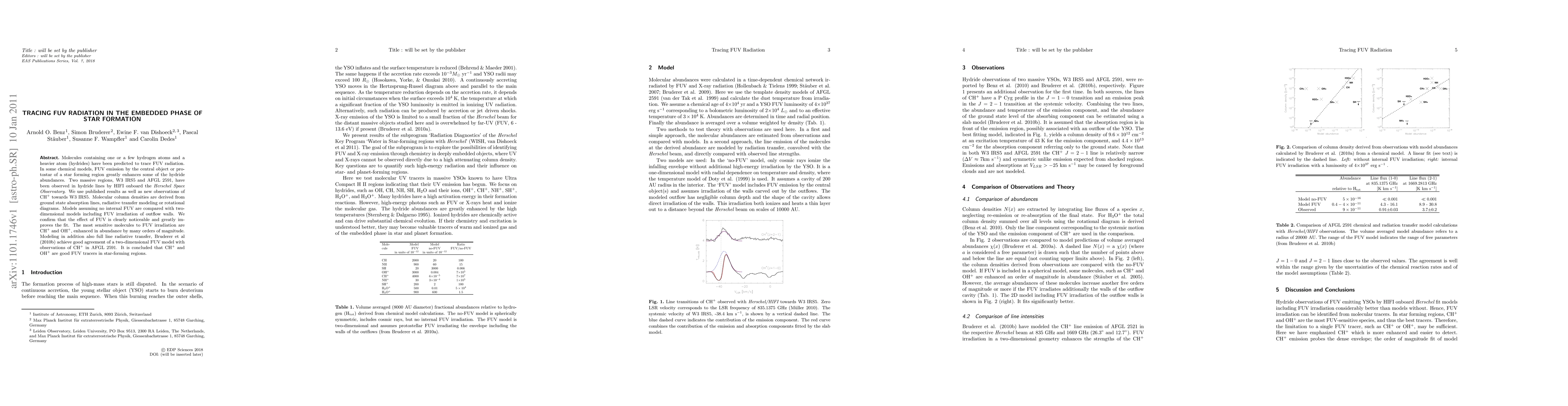 Molecules containing one or a few hydrogen atoms and a heavier atom (hydrides) have been predicted to trace FUV radiation. In some chemical models, FUV emission by the central object or protostar of a star forming region greatly enhances some of the hydride abundances. Two massive regions, W3 IRS5 and AFGL 2591, have been observed in hydride lines by HIFI onboard the {\it Herschel Space Observatory}. We use published results as well as new observations of CH$^+$ towards W3 IRS5. Molecular column densities are derived from ground state absorption lines, radiative transfer modeling or rotational diagrams. Models assuming no internal FUV are compared with two-dimensional models including FUV irradiation of outflow walls. We confirm that the effect of FUV is clearly noticeable and greatly improves the fit. The most sensitive molecules to FUV irradiation are CH$^+$ and OH$^+$, enhanced in abundance by many orders of magnitude. Modeling in addition also full line radiative transfer, Bruderer et al (2010b) achieve good agreement of a two-dimensional FUV model with observations of CH$^+$ in AFGL 2591. It is concluded that CH$^+$ and OH$^+$ are good FUV tracers in star-forming regions.