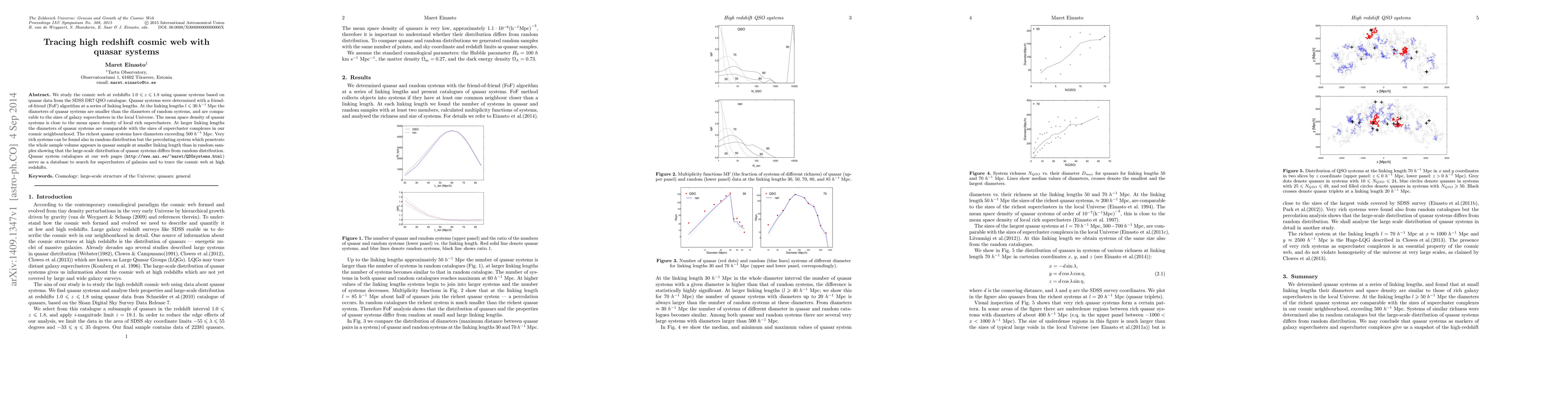 We study the cosmic web at redshifts 1.0 <= z <= 1.8 using quasar systems based on quasar data from the SDSS DR7 QSO catalogue. Quasar systems were determined with a friend-of-friend (FoF) algorithm at a series of linking lengths. At the linking lengths l <= 30 Mpc/h the diameters of quasar systems are smaller than the diameters of random systems, and are comparable to the sizes of galaxy superclusters in the local Universe. The mean space density of quasar systems is close to the mean space density of local rich superclusters. At larger linking lengths the diameters of quasar systems are comparable with the sizes of supercluster complexes in our cosmic neighbourhood. The richest quasar systems have diameters exceeding 500 Mpc/h. Very rich systems can be found also in random distribution but the percolating system which penetrate the whole sample volume appears in quasar sample at smaller linking length than in random samples showing that the large-scale distribution of quasar systems differs from random distribution. Quasar system catalogues at our web pages (http://www.aai.ee/~maret/QSOsystems.html) serve as a database to search for superclusters of galaxies and to trace the cosmic web at high redshifts.