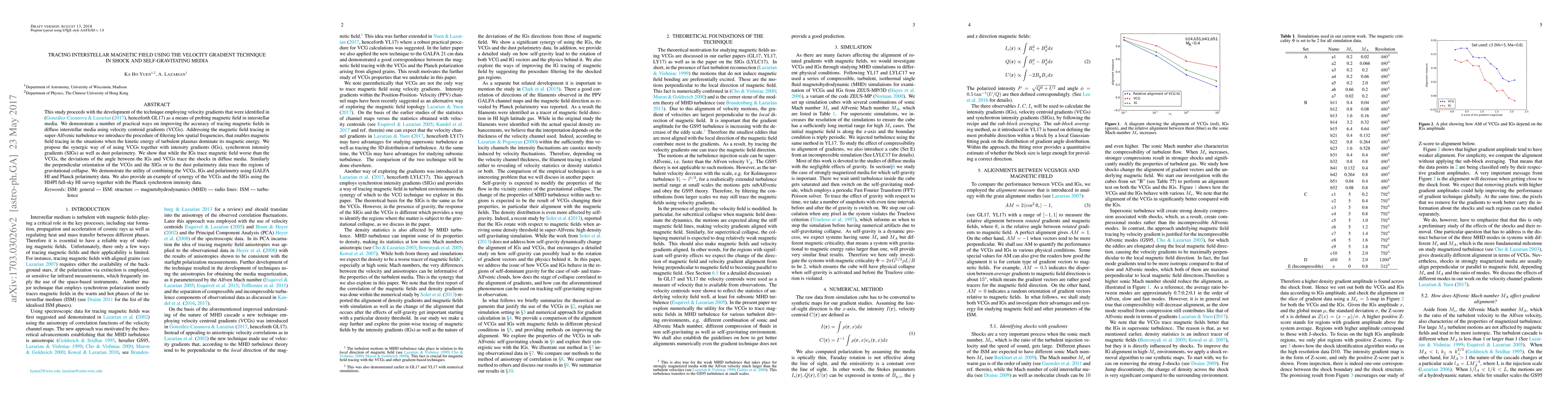 This paper develops a technique using velocity gradient analysis to trace interstellar magnetic fields in shock and self-gravitating media, improving accuracy through filtering and combining with intensity gradients, synchrotron intensity gradients, and dust polarimetry to better identify shocks and gravitational collapse regions.