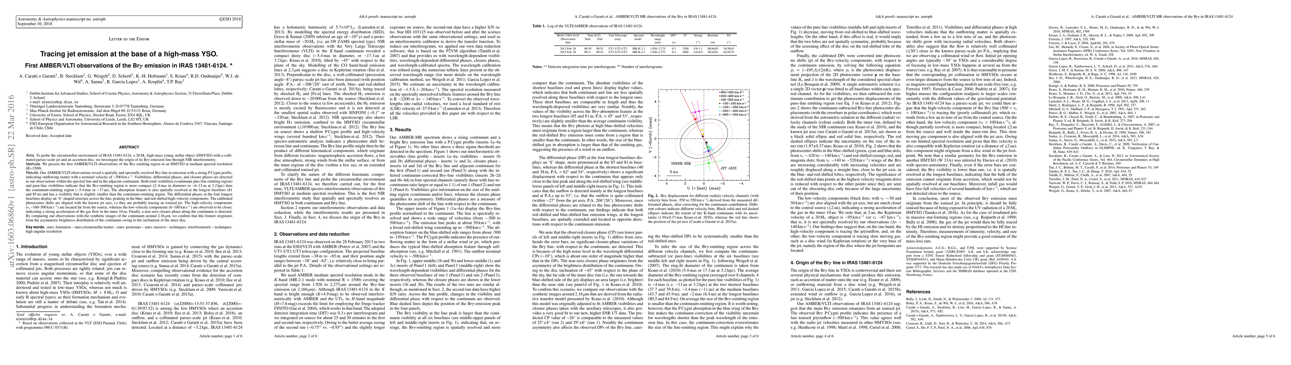 To probe the circumstellar environment of IRAS 13481-6124, a 20 M_sun high-mass young stellar object (HMYSO) with a parsec-scale jet and accretion disc, we investigate the origin of its Br\gamma-emission line through NIR interferometry. We present the first AMBER/VLTI observations of the Br\gamma-emitting region in an HMYSO at R~1500. Our AMBER/VLTI observations reveal a spatially and spectrally resolved Br\gamma-line in emission with a strong P Cygni profile, indicating outflowing matter with a terminal velocity of ~500 km/s. Visibilities, differential phases, and closure phases are detected in our observations within the spectral line and in the adjacent continuum. Both total visibilities (continuum plus line emitting region) and pure-line visibilities indicate that the Br\gamma-emitting region is more compact (2-4 mas in diameter or ~6-13 au at 3.2 kpc) than the continuum-emitting region (~5.4 mas or ~17 au). The absorption feature is also spatially resolved at the longest baselines (81 and 85 m) and has a visibility that is slightly smaller than the continuum-emitting region. The differential phases at the four longest baselines display an \u2018S\u2019-shaped structure across the line, peaking in the blue- and red-shifted high-velocity components. The calibrated photocentre shifts are aligned with the known jet axis, i.e they are probably tracing an ionised jet. The high-velocity components (v_r~100-500 km/s) are located far from the source, whereas the low-velocity components (0-100 km/s) are observed to be closer, indicating a strong acceleration of the gas flow in the inner 10 au. Finally, a non-zero closure phase along the continuum is detected. By comparing our observations with the synthetic images of the continuum around 2.16 um, we confirm that this feature originates from the asymmetric brightness distribution of the continuum owing to the inclination of the inner disc.