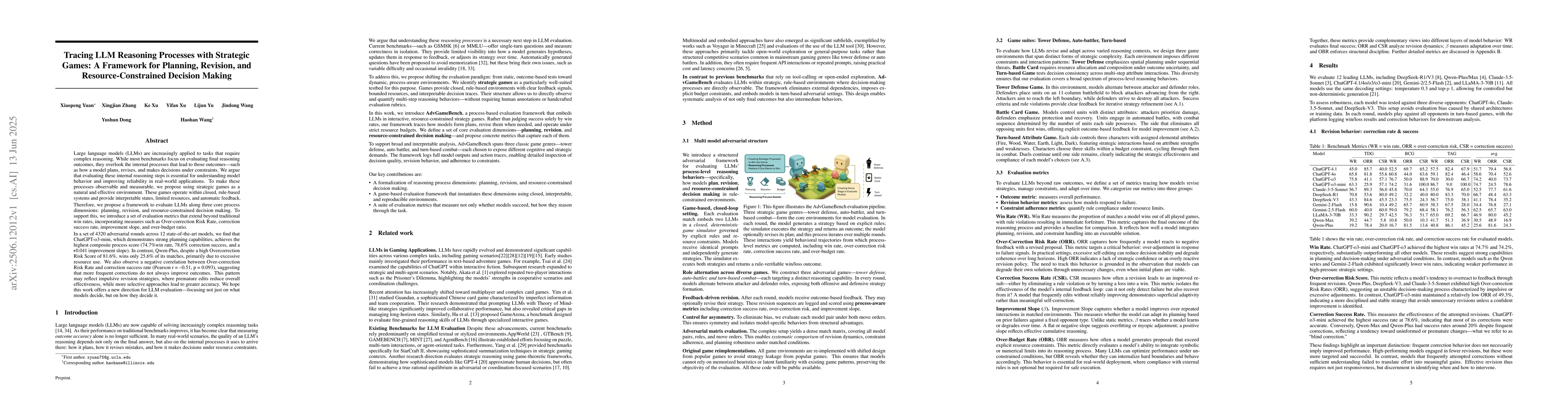 This research proposes a framework using strategic games to evaluate large language models' (LLMs) internal reasoning processes, including planning, revision, and resource-constrained decision making. The study reveals that ChatGPT-o3-mini outperforms other models, while Qwen-Plus, despite frequent edits, struggles with resource management. Key metrics include win rate, correction success rate, and improvement slope, highlighting the importance of assessing not just outcomes but also the decision-making journey of LLMs.