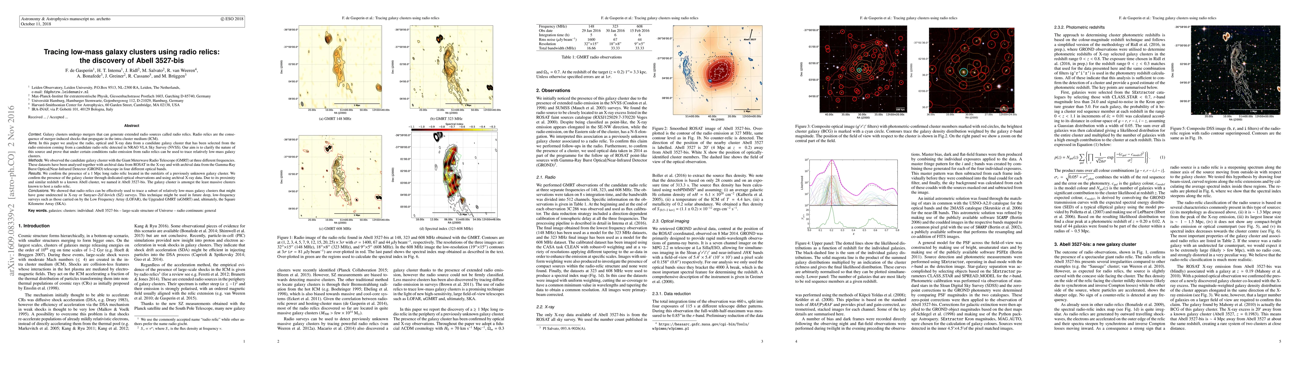 Galaxy clusters undergo mergers that can generate extended radio sources called radio relics. Radio relics are the consequence of merger-induced shocks that propagate in the intra cluster medium (ICM). In this paper we analyse the radio, optical and X-ray data from a candidate galaxy cluster that has been selected from the radio emission coming from a candidate radio relic detected in NRAO VLA Sky Survey (NVSS). Our aim is to clarify the nature of this source and prove that under certain conditions radio emission from radio relics can be used to trace relatively low-mass galaxy clusters. We have observed the candidate galaxy cluster with the Giant Meterwave Radio Telescope (GMRT) at three different frequencies. These datasets have been analysed together with archival data from ROSAT in the X-ray and with archival data from the Gamma-Ray Burst Optical/Near-Infrared Detector (GROND) telescope in four different optical bands. We confirm the presence of a 1 Mpc long radio relic located in the outskirts of a previously unknown galaxy cluster. We confirm the presence of the galaxy cluster through dedicated optical observations and using archival X-ray data. Due to its proximity and similar redshift to a known Abell cluster, we named it: Abell 3527-bis. The galaxy cluster is among the least massive cluster known to host a radio relic. We showed that radio relics can be effectively used to trace a subset of relatively low-mass galaxy clusters that might have gone undetected in X-ray or Sunyaev-Zel'dovich (SZ) surveys. This technique might be used in future deep, low-frequency surveys as those carried on by LOFAR, uGMRT and, ultimately, SKA.