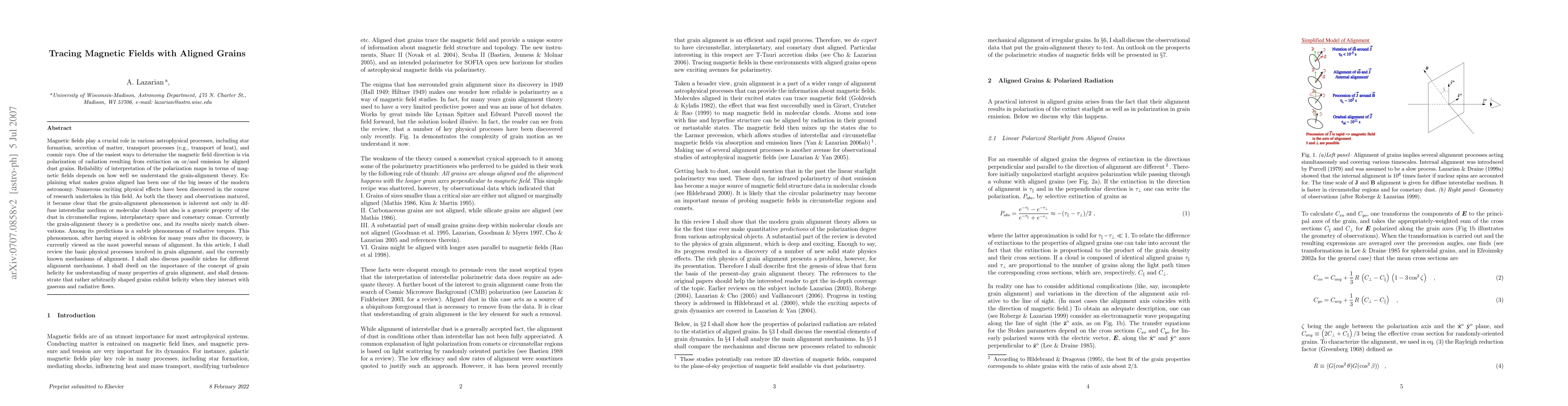 Magnetic fields play a crucial role in various astrophysical processes, including star formation, accretion of matter, transport processes (e.g., transport of heat), and cosmic rays. One of the easiest ways to determine the magnetic field direction is via polarization of radiation resulting from extinction on or/and emission by aligned dust grains. Reliability of interpretation of the polarization maps in terms of magnetic fields depends on how well we understand the grain-alignment theory. Currently the grain-alignment theory is a predictive one, and its results nicely match observations. Among its predictions is a subtle phenomenon of radiative torques. after having stayed in oblivion for many years after its discovery, is currently viewed as the most powerful means of alignment. In this article, I shall review the basic physical processes involved in grain alignment, and the currently known mechanisms of alignment. I shall also discuss possible niches for different alignment mechanisms. I shall dwell on the importance of the concept of grain helicity for understanding of many properties of grain alignment, and shall demonstrate that rather arbitrarily shaped grains exhibit helicity when they interact with gaseous flows and radiative fluxes.