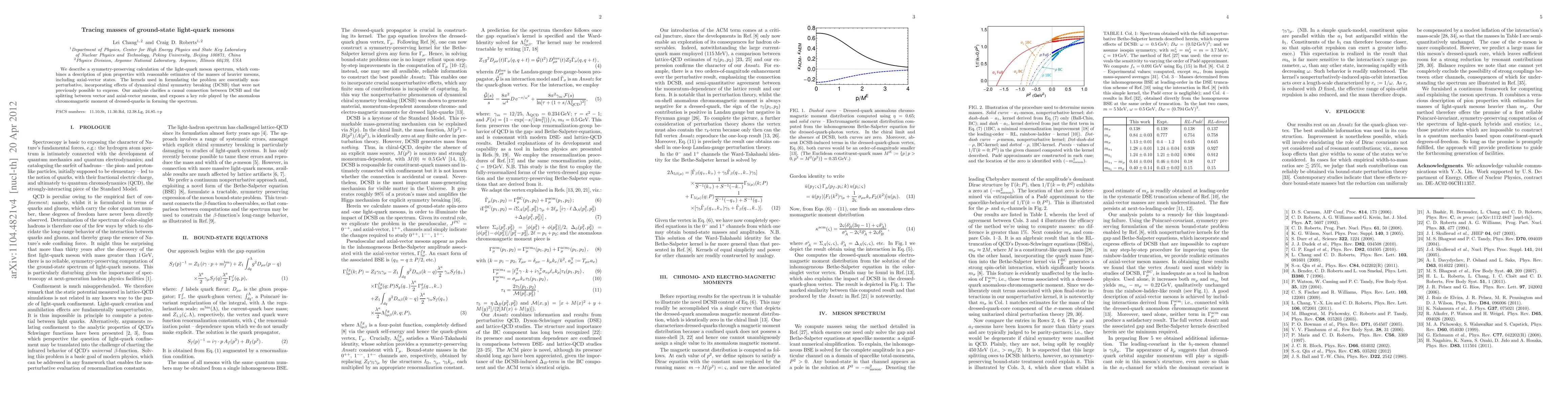 We describe a symmetry-preserving calculation of the meson spectrum, which combines a description of pion properties with reasonable estimates of the masses of heavier light-quark mesons, including axial-vector states. The kernels used in formulating the problem are essentially nonperturbative. They incorporate effects of dynamical chiral symmetry breaking (DCSB) that were not previously possible to express. Our analysis clarifies a causal connection between DCSB and the splitting between vector and axial-vector mesons, and exposes a key role played by the anomalous chromomagnetic moment of dressed-quarks in forming the spectrum.