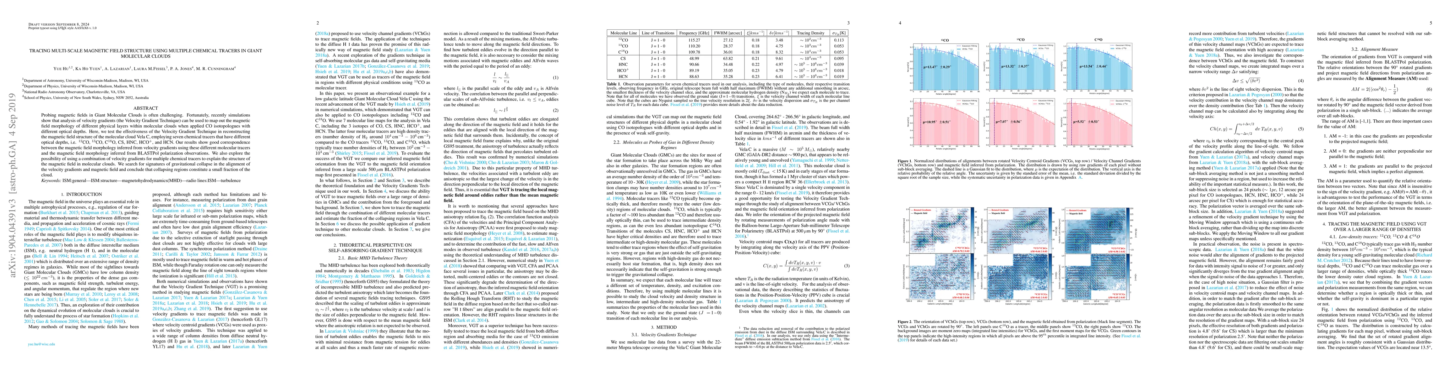 Probing magnetic fields in Giant Molecular Clouds is often challenging. Fortunately, recently simulations show that analysis of velocity gradients (the Velocity Gradient Technique) can be used to map out the magnetic field morphology of different physical layers within molecular clouds when applied CO isotopologues with different optical depths. Here, we test the effectiveness of the Velocity Gradient Technique in reconstructing the magnetic field structure of the molecular cloud Vela C, employing seven chemical tracers that have different optical depths, i.e. 12CO, 13CO, C18O, CS, HNC, HCO+, and HCN. Our results show good correspondence between the magnetic field morphology inferred from velocity gradients using these different molecular tracers and the magnetic field morphology inferred from BLASTPol polarization observations. We also explore the possibility of using a combination of velocity gradients for multiple chemical tracers to explain the structure of the magnetic field in molecular clouds. We search for signatures of gravitational collapse in the alignment of the velocity gradients and magnetic field and conclude that collapsing regions constitute a small fraction of the cloud.