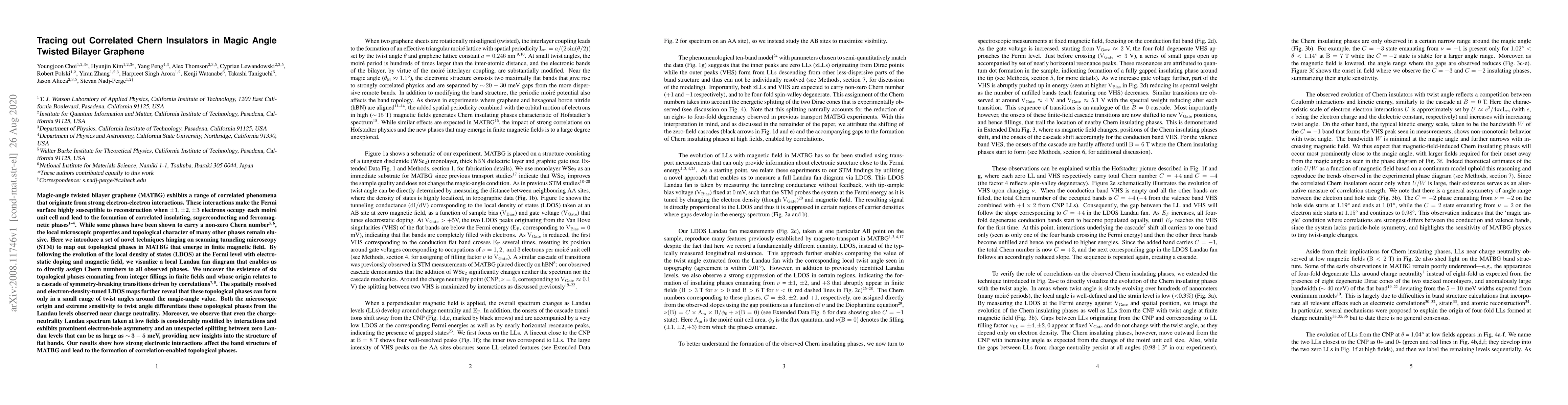 This paper introduces novel scanning tunneling microscopy techniques to map topological phases in magic-angle twisted bilayer graphene, revealing six correlated Chern insulators. The study shows these phases emerge from symmetry-breaking transitions driven by strong electron-electron interactions and are sensitive to twist angles, differentiating them from conventional Landau levels.