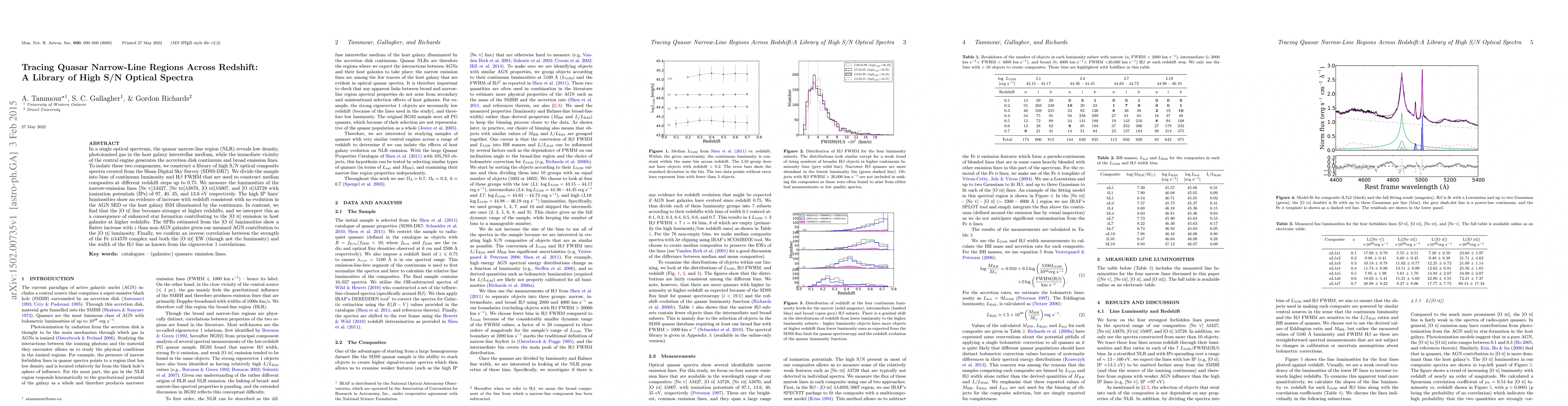 In a single optical spectrum, the quasar narrow-line region (NLR) reveals low density, photoionized gas in the host galaxy interstellar medium, while the immediate vicinity of the central engine generates the accretion disk continuum and broad emission lines. To isolate these two components, we construct a library of high S/N optical composite spectra created from the Sloan Digital Sky Survey (SDSS-DR7). We divide the sample into bins of continuum luminosity and Hbeta FWHM that are used to construct median composites at different redshift steps up to 0.75. We measure the luminosities of the narrow-emission lines [NeV]3427, [NeIII]3870, [OIII]5007, and [OII]3728 with ionization potentials (IPs) of 97, 40, 35, and 13.6 eV respectively. The high IP lines' luminosities show no evidence of increase with redshift consistent with no evolution in the AGN SED or the host galaxy ISM illuminated by the continuum. In contrast, we find that the [OII] line becomes stronger at higher redshifts, and we interpret this as a consequence of enhanced star formation contributing to the [OII] emission in host galaxies at higher redshifts. The SFRs estimated from the [OII] luminosities show a flatter increase with z than non-AGN galaxies given our assumed AGN contribution to the [OII] luminosity. Finally, we confirm an inverse correlation between the strength of the FeII4570 complex and both the [OIII] EW (though not the luminosity) and the width of the Hbeta line as known from the eigenvector 1 correlations.