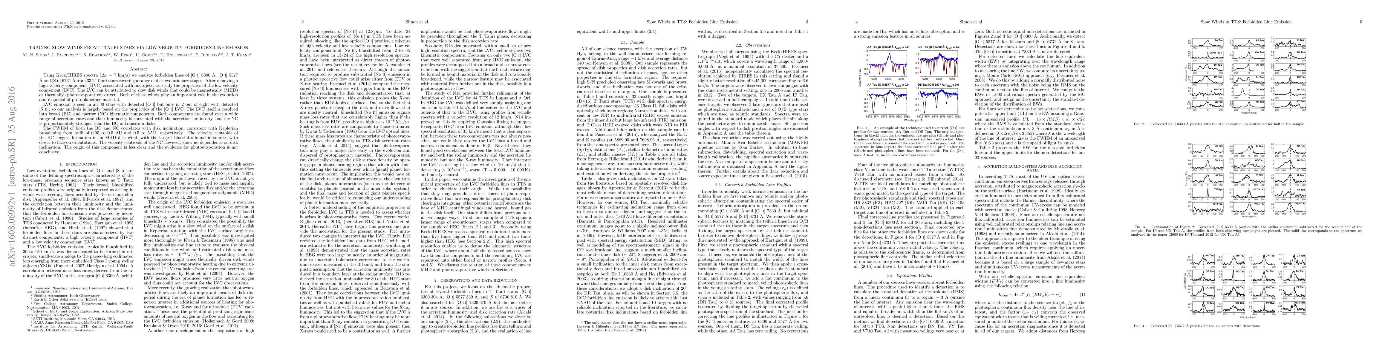 Using Keck/HIRES spectra {\Delta}v ~ 7 km/s, we analyze forbidden lines of [O I] 6300 {\AA}, [O I] 5577 {\AA} and [S II] 6731 {\AA} from 33 T Tauri stars covering a range of disk evolutionary stages. After removing a high velocity component (HVC) associated with microjets, we study the properties of the low velocity component (LVC). The LVC can be attributed to slow disk winds that could be magnetically (MHD) or thermally (photoevaporative) driven. Both of these winds play an important role in the evolution and dispersal of protoplanetary material. LVC emission is seen in all 30 stars with detected [O I] but only in 2 out of eight with detected [S II] , so our analysis is largely based on the properties of the [O I] LVC. The LVC itself is resolved into broad (BC) and narrow (NC) kinematic components. Both components are found over a wide range of accretion rates and their luminosity is correlated with the accretion luminosity, but the NC is proportionately stronger than the BC in transition disks. The FWHM of both the BC and NC correlates with disk inclination, consistent with Keplerian broadening from radii of 0.05 to 0.5 AU and 0.5 to 5 AU, respectively. The velocity centroids of the BC suggest formation in an MHD disk wind, with the largest blueshifts found in sources with closer to face-on orientations. The velocity centroids of the NC however, show no dependence on disk inclination. The origin of this component is less clear and the evidence for photoevaporation is not conclusive.