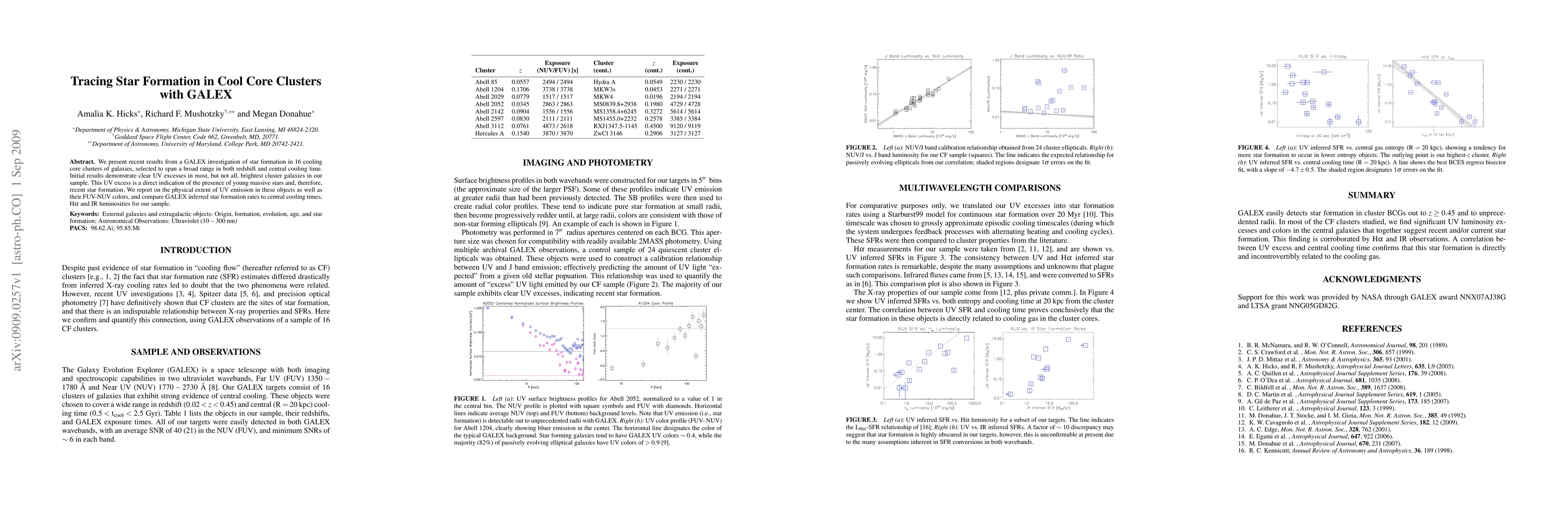 This study uses GALEX data to investigate star formation in 16 cooling core galaxy clusters, finding UV excesses in most brightest cluster galaxies indicating recent star formation. The research correlates UV emission extent and colors with star formation rates, central cooling times, H-alpha, and IR luminosities.