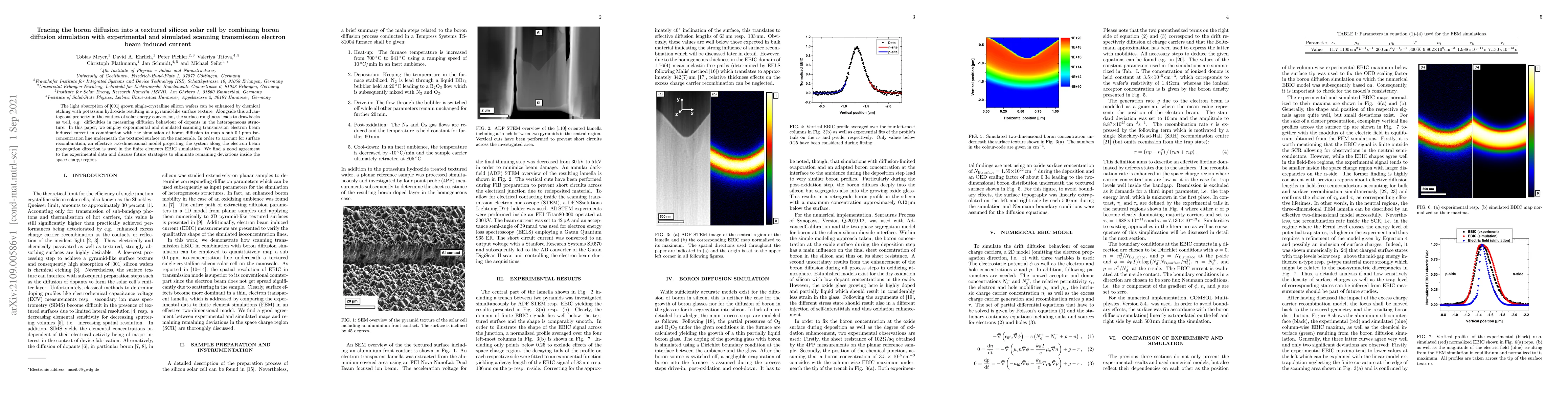 The light absorption of [001] grown single-crystalline silicon wafers can be enhanced by chemical etching with potassium hydroxide resulting in a pyramid-like surface texture. Alongside this advantageous property in the context of solar energy conversion, the surface roughness leads to drawbacks as well, e.g. difficulties in measuring diffusion behaviour of dopants in the heterogeneous structure. In this paper, we employ experimental and simulated scanning transmission electron beam induced current in combination with the simulation of boron diffusion to map a sub 0.1 ppm isoconcentration line underneath the textured surface on the nanoscale. In order to account for surface recombination, an effective two-dimensional model projecting the system along the electron beam propagation direction is used in the finite elements EBIC simulation. We find a good agreement to the experimental data and discuss future strategies to eliminate remaining deviations inside the space charge region.