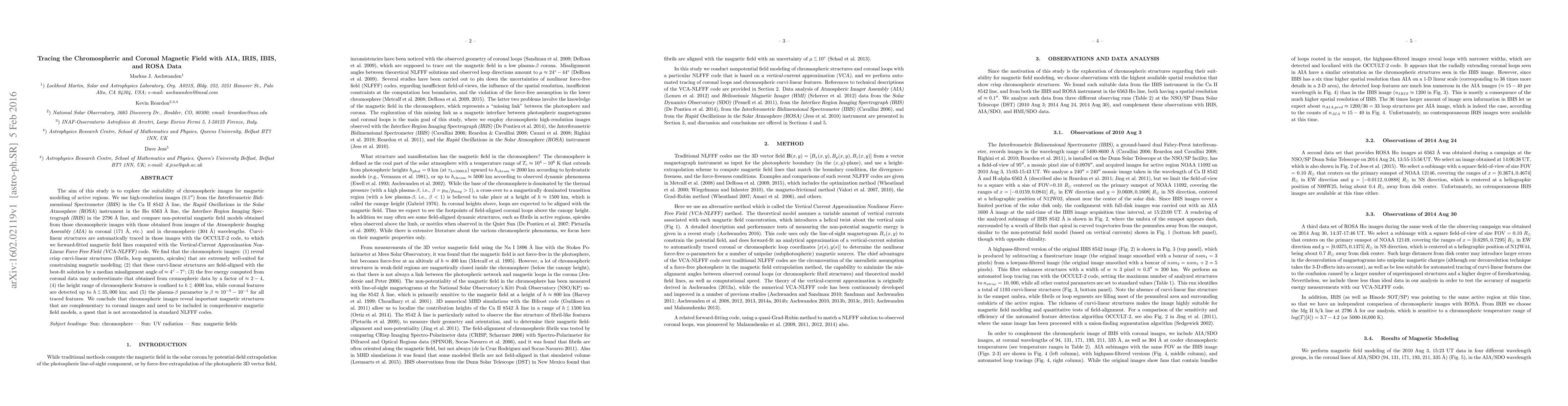 The aim of this study is to explore the suitability of chromospheric images for magnetic modeling of active regions. We use high-resolution images (0.1") from the Interferometric Bidimensional Spectrometer (IBIS) in the Ca II 8542 A line, the Rapid Oscillations in the Solar Atmosphere (ROSA) instrument in the H-alpha 6563 A line, the Interface Region Imaging Spectrograph (IRIS) in the 2796 A line, and compare non-potential magnetic field models obtained from those chromospheric images with those obtained from images of the Atmospheric Imaging Assembly (AIA) in coronal (171 A, etc.) and in chromospheric (304 A) wavelengths. Curvi-linear structures are automatically traced in those images with the OCCULT-2 code, to which we forward-fitted magnetic field lines computed with the Vertical-Current Approximation Non-Linear Force Free Field (VCA-NLFFF) code. We find that the chromospheric images: (1) reveal crisp curvi-linear structures (fibrils, loop segments, spicules) that are extremely well-suited for constraining magnetic modeling; (2) that these curvi-linear structures are field-aligned with the best-fit solution by a median misalignment angle of ~4-7 deg; (3) the free energy computed from coronal data may underestimate that obtained from cromospheric data by a factor of ~ 2-4, (4) the height range of chromospheric features is confined to h ~ 4000$ km, while coronal features are detected up to h ~ 35,000$ km; and (5) the plasma-beta parameter is beta ~ 10^(-5)-10^(-1) for all traced features. We conclude that chromospheric images reveal important magnetic structures that are complementary to coronal images and need to be included in comprehensive magnetic field models, a quest that is not accomodated in standard NLFFF codes.
