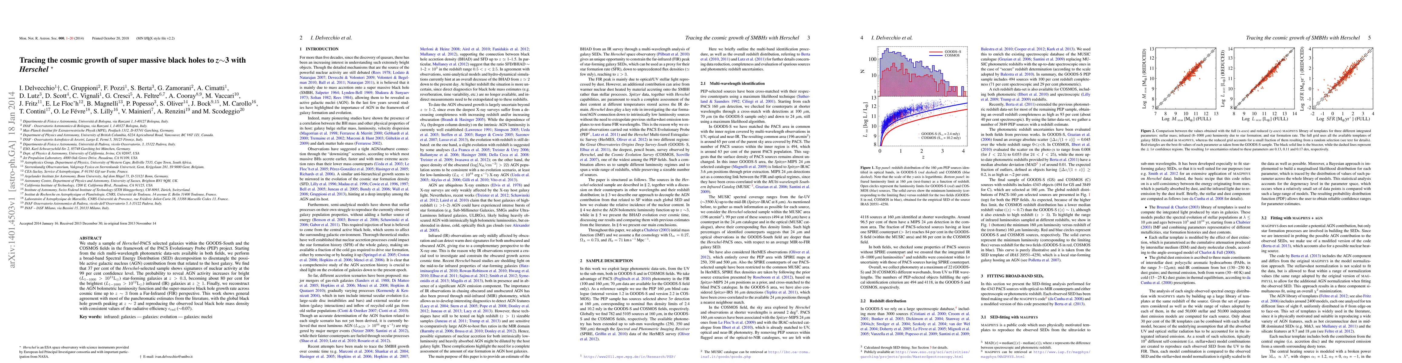 We study a sample of Herschel-PACS selected galaxies within the GOODS-South and the COSMOS fields in the framework of the PACS Evolutionary Probe (PEP) project. Starting from the rich multi-wavelength photometric data-sets available in both fields, we perform a broad-band Spectral Energy Distribution (SED) decomposition to disentangle the possible active galactic nucleus (AGN) contribution from that related to the host galaxy. We find that 37 per cent of the Herschel-selected sample shows signatures of nuclear activity at the 99 per cent confidence level. The probability to reveal AGN activity increases for bright ($L_{\rm 1-1000} > 10^{11} \rm L_{\odot}$) star-forming galaxies at $z>0.3$, becoming about 80 per cent for the brightest ($L_{\rm 1-1000} > 10^{12} \rm L_{\odot}$) infrared (IR) galaxies at $z \geq 1$. Finally, we reconstruct the AGN bolometric luminosity function and the super-massive black hole growth rate across cosmic time up to $z \sim 3$ from a Far-Infrared (FIR) perspective. This work shows general agreement with most of the panchromatic estimates from the literature, with the global black hole growth peaking at $z \sim 2$ and reproducing the observed local black hole mass density with consistent values of the radiative efficiency $\epsilon_{\rm rad}$ ($\sim$0.07).
