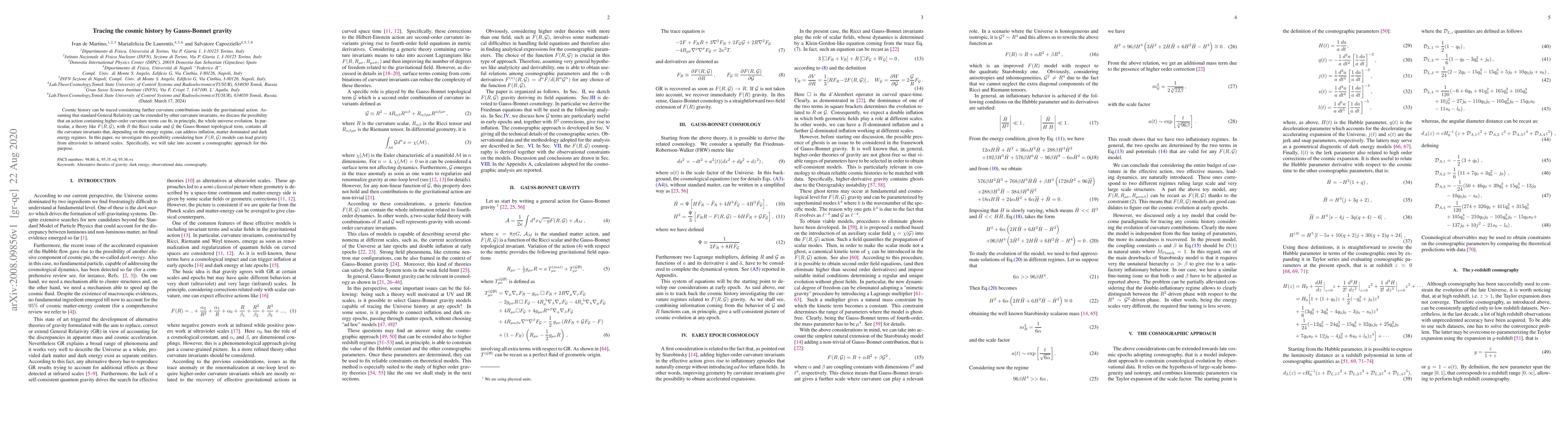 Cosmic history can be traced considering further curvature contributions inside the gravitational action. Assuming that standard General Relativity can be extended by other curvature invariants, we discuss the possibility that an action containing higher-order curvature terms can fit, in principle, the whole universe evolution. In particular, a theory like $F(R,{\cal G})$, with $R$ the Ricci scalar and $\cal G$ the Gauss-Bonnet topological term, contains all the curvature invariants that, depending on the energy regime, can address inflation, matter dominated and dark energy regimes. In this paper, we investigate this possibility considering how $F(R,{\cal G})$ models can lead gravity from ultraviolet to infrared scales. Specifically, we will take into account a cosmographic approach for this purpose.