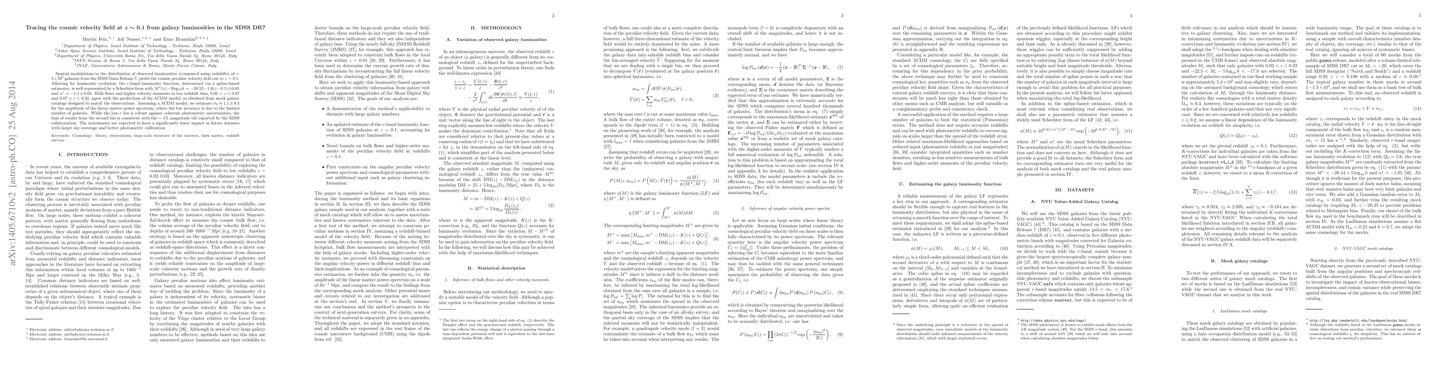 Spatial modulations in the distribution of observed luminosities (computed using redshifts) of ~ 5 $\times$ 10$^5$ galaxies from the SDSS Data Release 7, probe the cosmic peculiar velocity field out to z ~ 0.1. Allowing for luminosity evolution, the r-band luminosity function, determined via a spline-based estimator, is well represented by a Schechter form with M$^{\star}$(z) - 5log$_{10}$h = -20.52 - 1.6(z - 0.1) $\pm$ 0.05 and $\alpha^{\star}$ = -1.1 $\pm$ 0.03. Bulk flows and higher velocity moments in two redshift bins, 0.02 < z < 0.07 and 0.07 < z < 0.22, agree with the predictions of the $\Lambda$CDM model, as obtained from mock galaxy catalogs designed to match the observations. Assuming a $\Lambda$CDM model, we estimate $\sigma_{8}$ $\approx$ 1.1 $\pm$ 0.4 for the amplitude of the linear matter power spectrum, where the low accuracy is due to the limited number of galaxies. While the low-z bin is robust against coherent photometric uncertainties, the bias of results from the second bin is consistent with the ~ 1% magnitude tilt reported by the SDSS collaboration. The systematics are expected to have a significantly lower impact in future datasets with larger sky coverage and better photometric calibration.