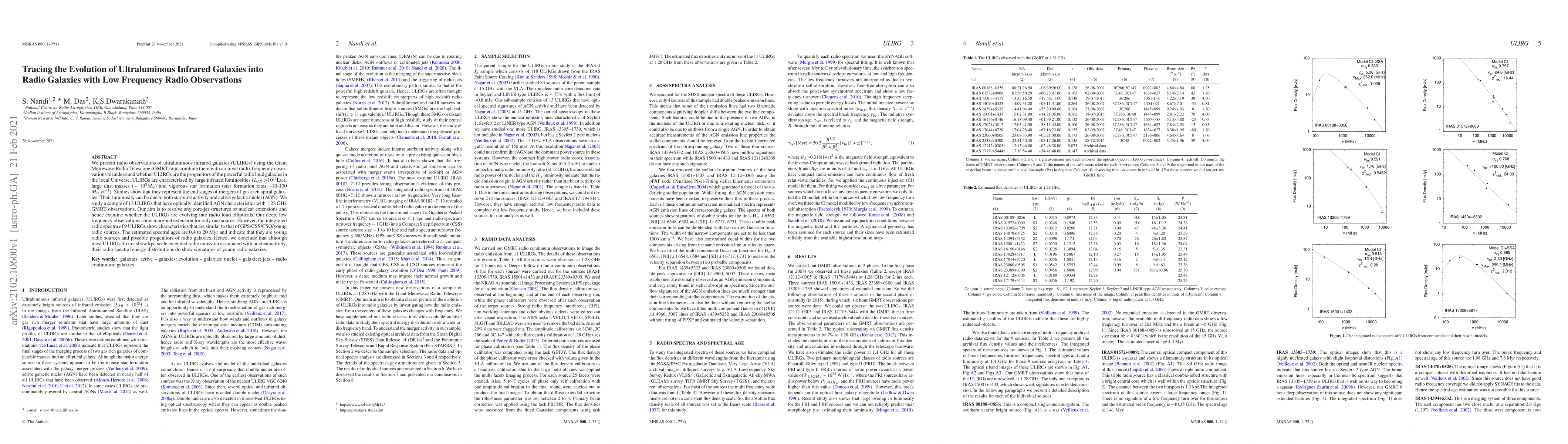 This study uses low-frequency radio observations from the GMRT to investigate whether ultraluminous infrared galaxies (ULIRGs) evolve into radio-loud galaxies. While most ULIRGs lack kpc-scale radio extensions, their integrated radio spectra suggest they are young radio sources, indicating potential evolution into radio galaxies.