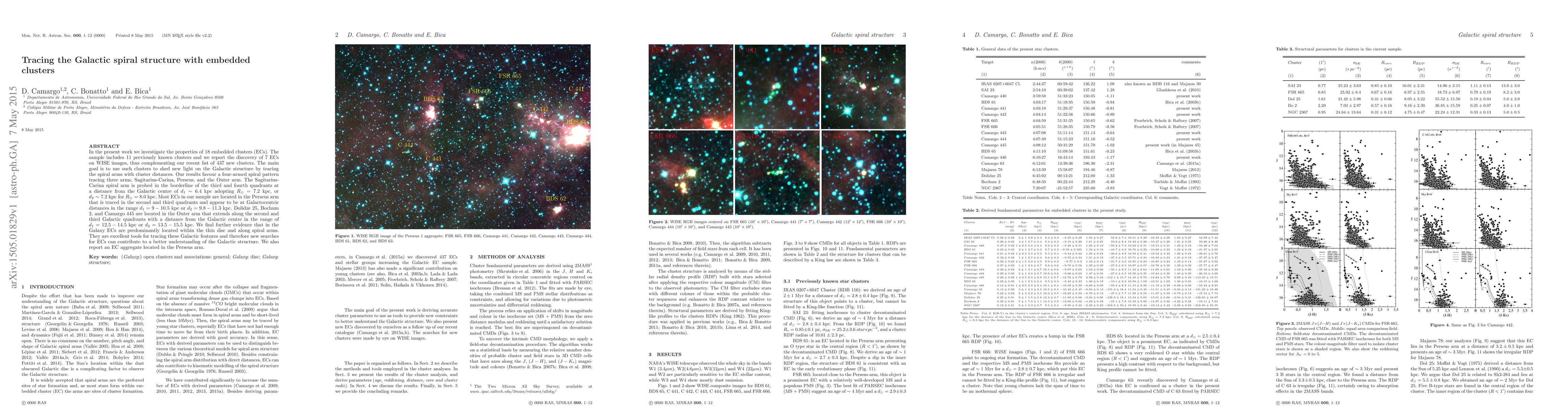 In the present work we investigate the properties of 18 embedded clusters (ECs). The sample includes 11 previously known clusters and we report the discovery of 7 ECs on WISE images, thus complementing our recent list of 437 new clusters. The main goal is to use such clusters to shed new light on the Galactic structure by tracing the spiral arms with cluster distances. Our results favour a four-armed spiral pattern tracing three arms, Sagitarius-Carina, Perseus, and the Outer arm. The Sagitarius-Carina spiral arm is probed in the borderline of the third and fourth quadrants at a distance from the Galactic centre of $d_1\sim6.4$ kpc adopting $R_{\odot}=7.2$ kpc, or $d_2\sim7.2$ kpc for $R_{\odot}=8.0$ kpc. Most ECs in our sample are located in the Perseus arm that is traced in the second and third quadrants and appear to be at Galactocentric distances in the range $d_1=9-10.5$ kpc or $d_2=9.8-11.3$ kpc. Dolidze 25, Bochum 2, and Camargo 445 are located in the Outer arm that extends along the second and third Galactic quadrants with a distance from the Galactic centre in the range of $d_1=12.5-14.5$ kpc or $d_2=13.5-15.5$ kpc. We find further evidence that in the Galaxy ECs are predominantly located within the thin disc and along spiral arms. They are excellent tools for tracing these Galactic features and therefore new searches for ECs can contribute to a better understanding of the Galactic structure. We also report an EC aggregate located in the Perseus arm.