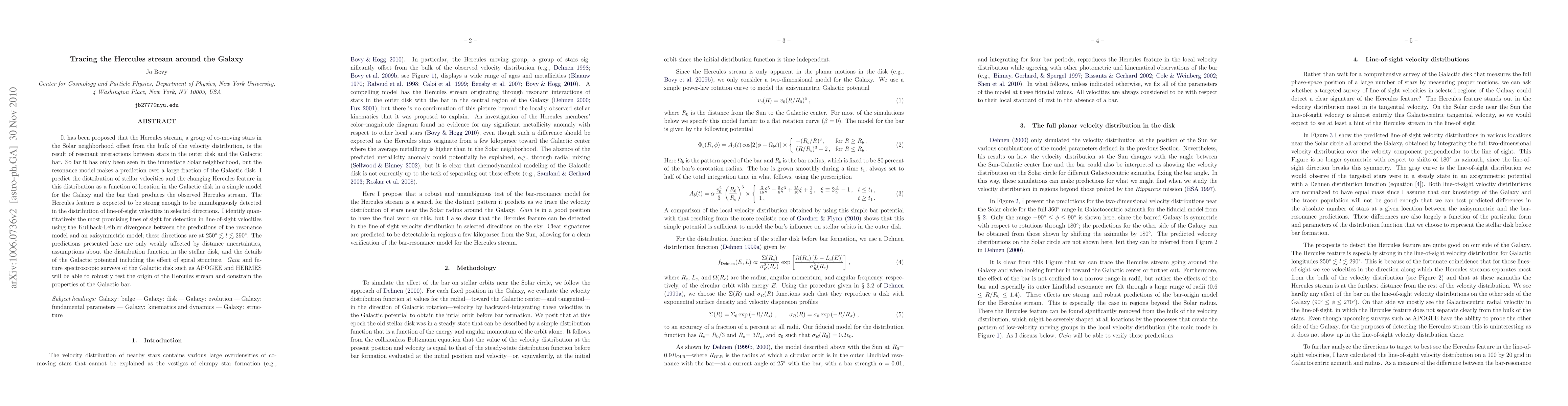 Researchers predict the Hercules stream, a group of co-moving stars, can be detected in line-of-sight velocities across a large fraction of the Galactic disk using Gaia and future spectroscopic surveys.