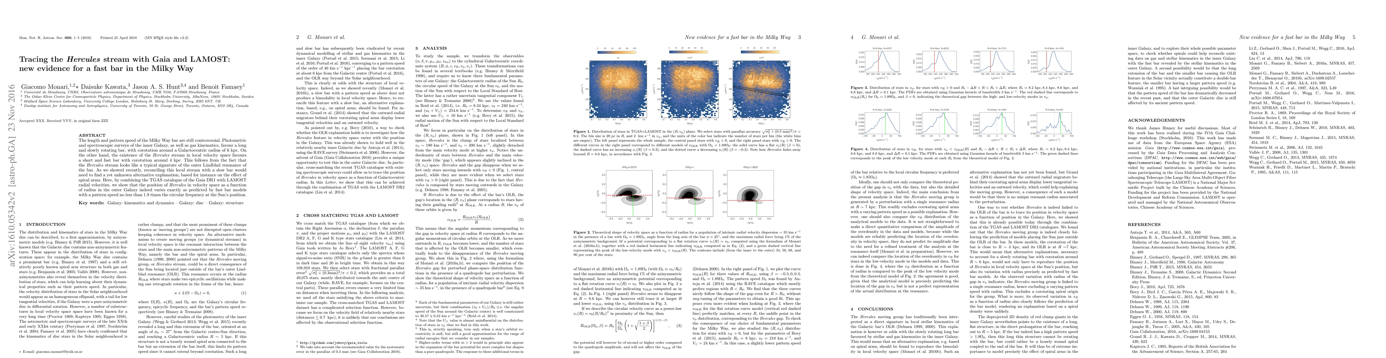This study combines Gaia DR1 and LAMOST data to trace the Hercules stream, providing evidence for a fast rotating bar in the Milky Way with a corotation radius around 4 kpc, in contrast to the long, slowly rotating bar models previously favored. The findings support a fast bar model with a pattern speed at least 1.8 times the circular frequency at the Sun's position.