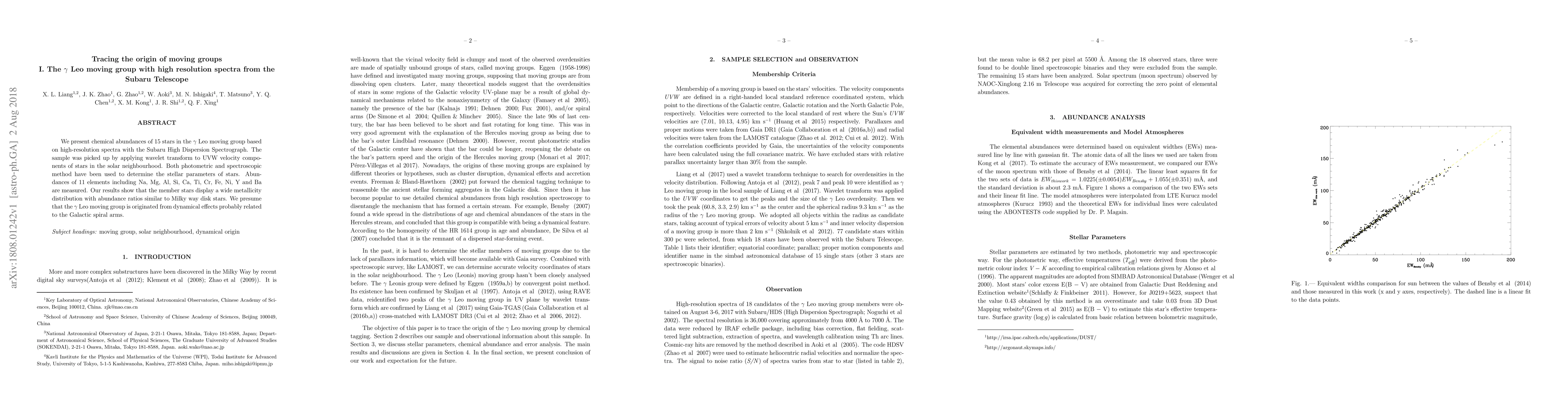 This study, using Subaru Telescope's high-resolution spectra, analyzes 15 {gamma} Leo moving group stars. Findings reveal a wide metallicity range among members, with elemental ratios akin to Milky Way disk stars. The research suggests the group's origin could be from Galactic spiral arm-related dynamical effects.