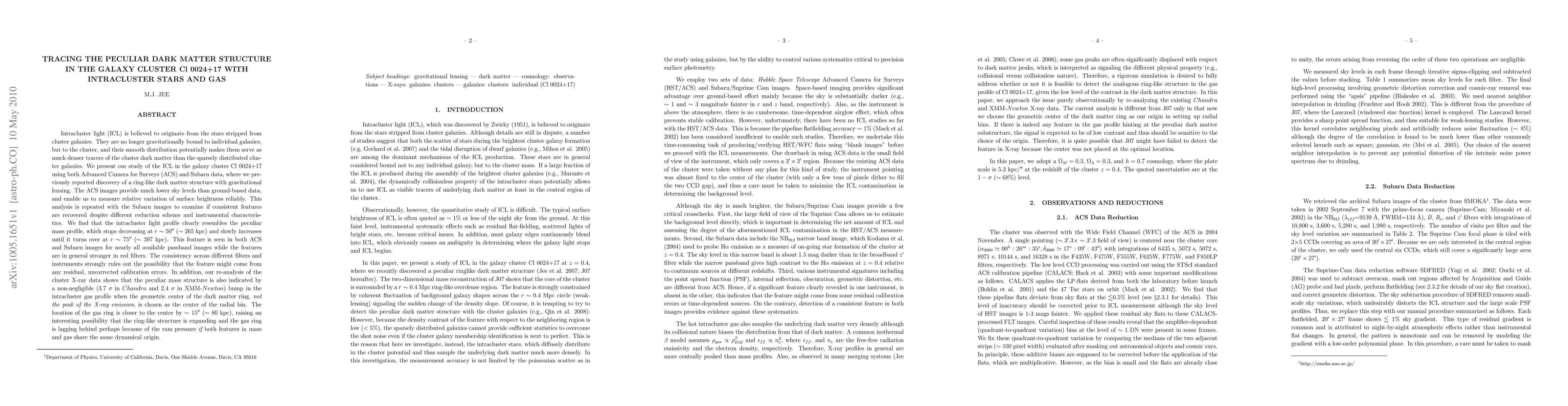 This study investigates the intracluster light (ICL) in galaxy cluster CL 0024+17, revealing a peculiar dark matter structure resembling a ring that stops decreasing and slowly increases in mass. Both ACS and Subaru data confirm this feature, suggesting it is not due to calibration errors.