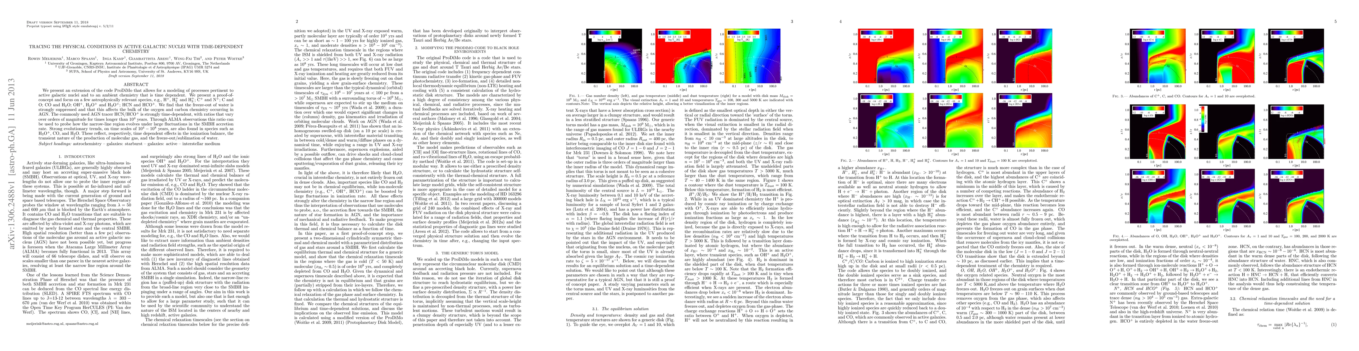 We present an extension of the code ProDiMo that allows for a modeling of processes pertinent to active galactic nuclei and to an ambient chemistry that is time dependent. We present a proof-of-concept and focus on a few astrophysically relevant species, e.g., H+, H2+ and H3+; C+ and N+; C and O; CO and H2O; OH+, H2O+ and H3O+; HCN and HCO+. We find that the freeze-out of water is strongly suppressed and that this affects the bulk of the oxygen and carbon chemistry occurring in AGN. The commonly used AGN tracer HCN/HCO+ is strongly time-dependent, with ratios that vary over orders of magnitude for times longer than 10^4 years. Through ALMA observations this ratio can be used to probe how the narrow-line region evolves under large fluctuations in the SMBH accretion rate. Strong evolutionary trends, on time scales of 10^4-10^8 years, are also found in species such as H3O+, CO, and H2O. These reflect, respectively, time dependent effects in the ionization balance, the transient nature of the production of molecular gas, and the freeze-out/sublimation of water.