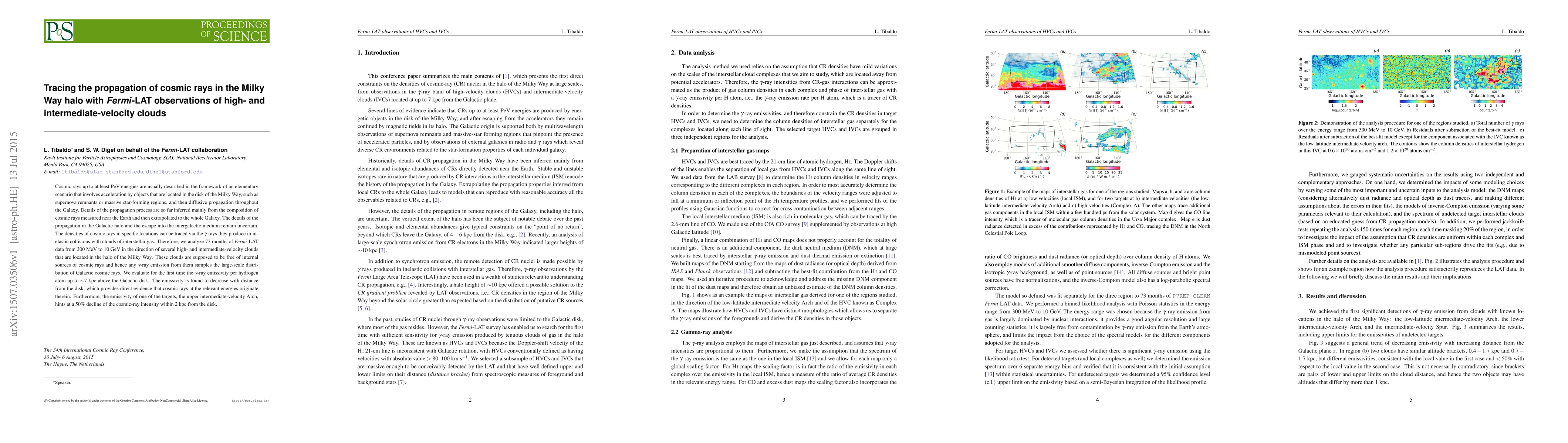 This study uses Fermi-LAT observations to trace cosmic rays in the Milky Way's halo via gamma rays produced by their collisions with high- and intermediate-velocity clouds. The analysis reveals a decrease in gamma-ray emissivity with distance from the Galactic disk, indicating that cosmic rays at PeV energies primarily originate from sources within the disk.