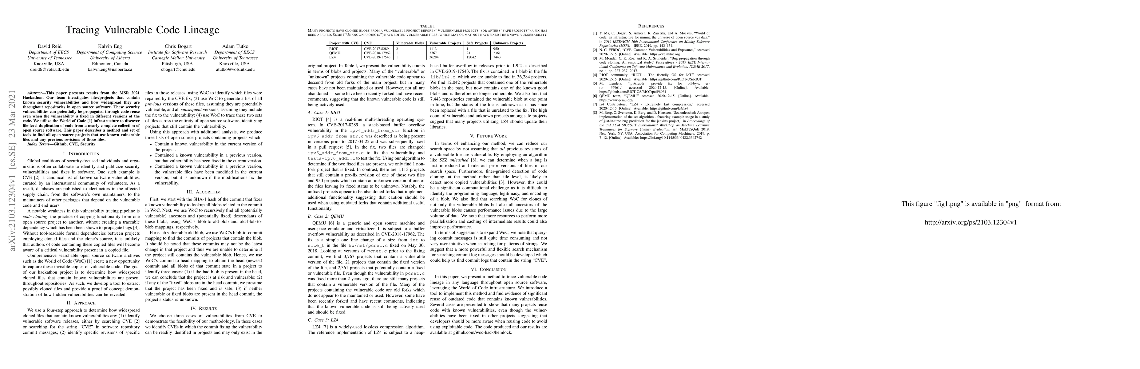 This paper investigates the propagation of known security vulnerabilities through code reuse in open source software using the World of Code infrastructure. It presents tools and methods to trace vulnerable code lineage across repositories, identifying projects that utilize vulnerable files and their previous revisions.