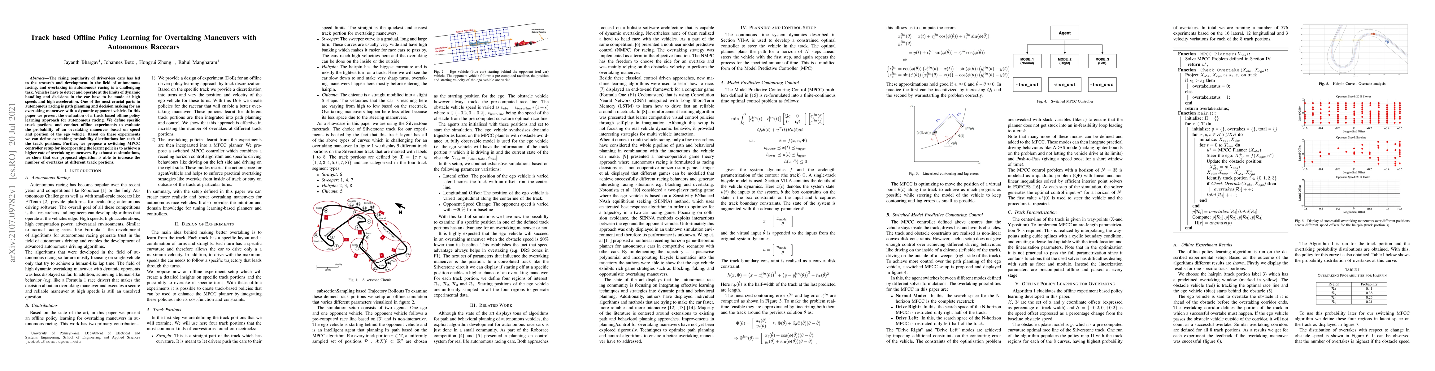 The rising popularity of driver-less cars has led to the research and development in the field of autonomous racing, and overtaking in autonomous racing is a challenging task. Vehicles have to detect and operate at the limits of dynamic handling and decisions in the car have to be made at high speeds and high acceleration. One of the most crucial parts in autonomous racing is path planning and decision making for an overtaking maneuver with a dynamic opponent vehicle. In this paper we present the evaluation of a track based offline policy learning approach for autonomous racing. We define specific track portions and conduct offline experiments to evaluate the probability of an overtaking maneuver based on speed and position of the ego vehicle. Based on these experiments we can define overtaking probability distributions for each of the track portions. Further, we propose a switching MPCC controller setup for incorporating the learnt policies to achieve a higher rate of overtaking maneuvers. By exhaustive simulations, we show that our proposed algorithm is able to increase the number of overtakes at different track portions.