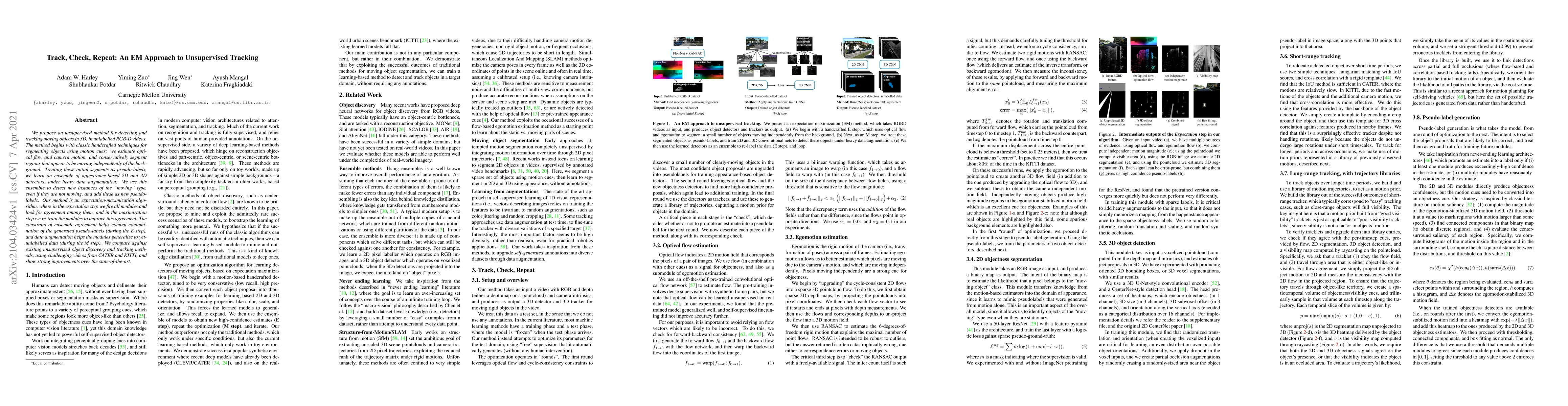 We propose an unsupervised method for detecting and tracking moving objects in 3D, in unlabelled RGB-D videos. The method begins with classic handcrafted techniques for segmenting objects using motion cues: we estimate optical flow and camera motion, and conservatively segment regions that appear to be moving independently of the background. Treating these initial segments as pseudo-labels, we learn an ensemble of appearance-based 2D and 3D detectors, under heavy data augmentation. We use this ensemble to detect new instances of the "moving" type, even if they are not moving, and add these as new pseudo-labels. Our method is an expectation-maximization algorithm, where in the expectation step we fire all modules and look for agreement among them, and in the maximization step we re-train the modules to improve this agreement. The constraint of ensemble agreement helps combat contamination of the generated pseudo-labels (during the E step), and data augmentation helps the modules generalize to yet-unlabelled data (during the M step). We compare against existing unsupervised object discovery and tracking methods, using challenging videos from CATER and KITTI, and show strong improvements over the state-of-the-art.