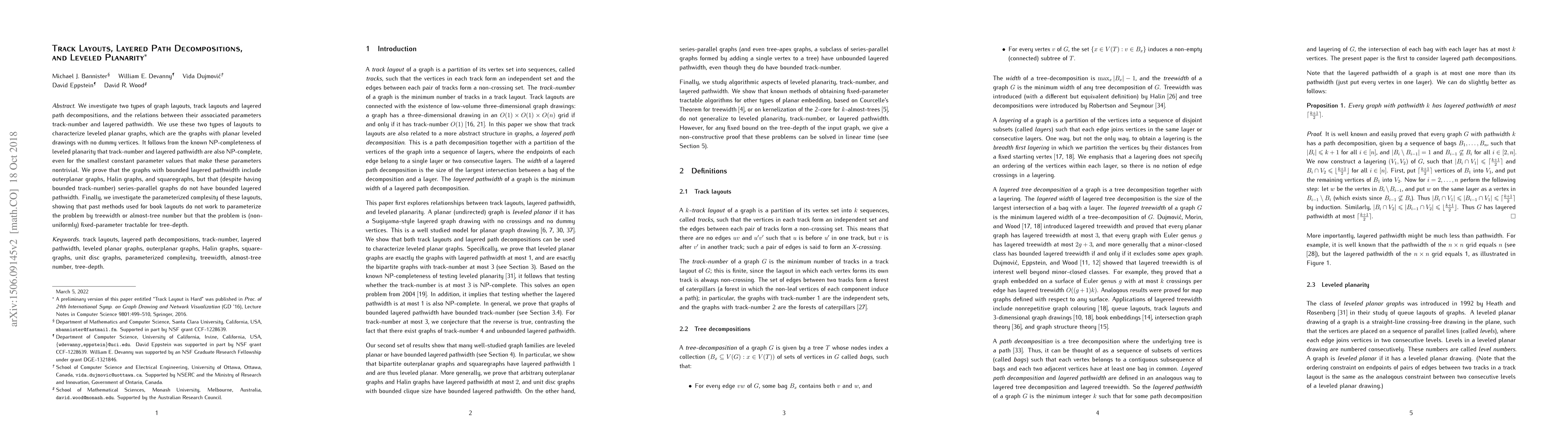Researchers investigate graph layouts and their parameters to characterize leveled planar graphs, showing that certain types of graphs have bounded track-number or layered pathwidth, but others do not, with implications for parameterized complexity.