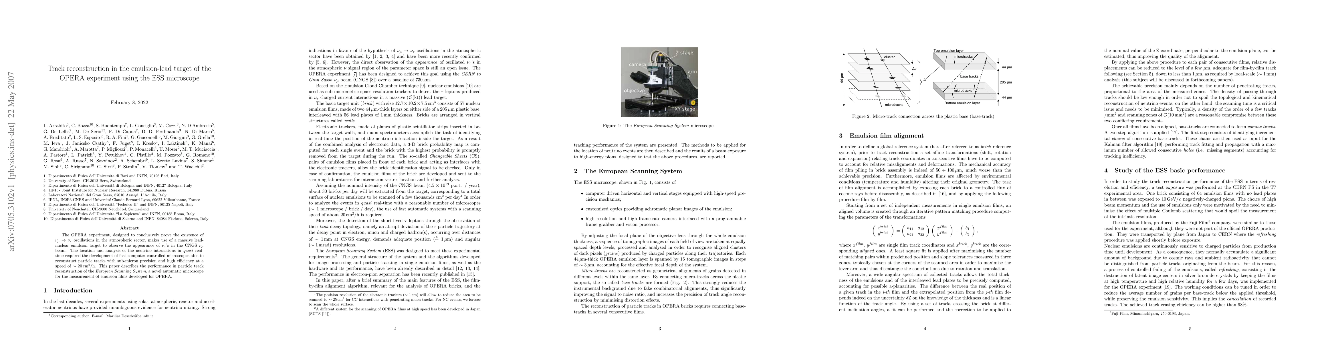 The OPERA experiment aims to detect $\rm \nu_\tau$ appearance via $\rm \nu_\mu \to \nu_\tau$ oscillations using a lead-nuclear emulsion target. The ESS microscope was developed for fast, high-precision track reconstruction in the emulsion films, achieving 20 cm^2/h efficiency.