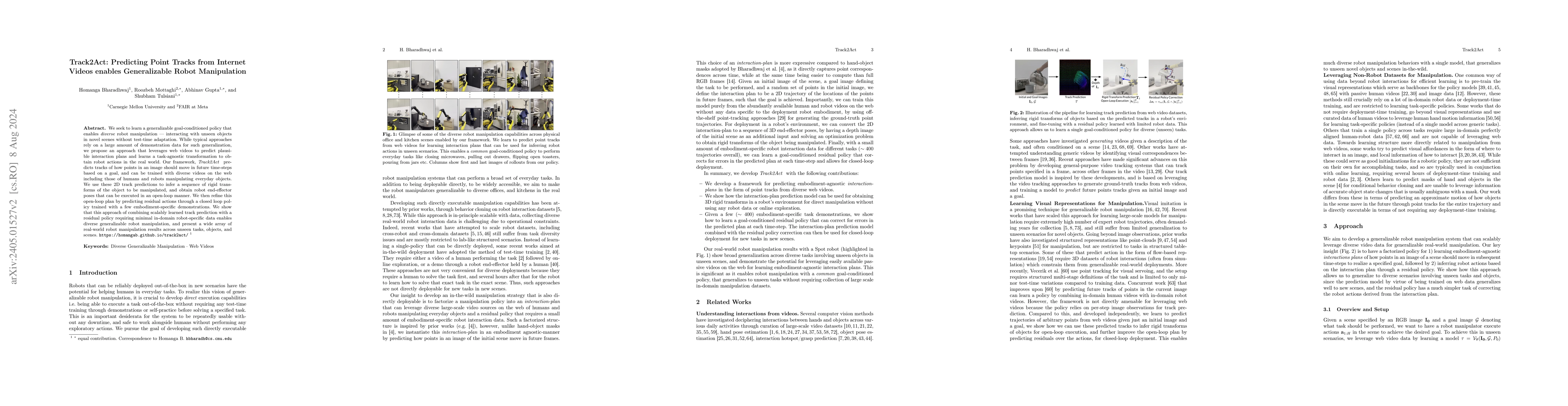 Track2Act is a framework that predicts interaction plans for robots to manipulate unseen objects by leveraging web videos for track predictions, combined with minimal in-domain demonstrations to refine actions, enabling zero-shot robot manipulation across diverse tasks and scenes.