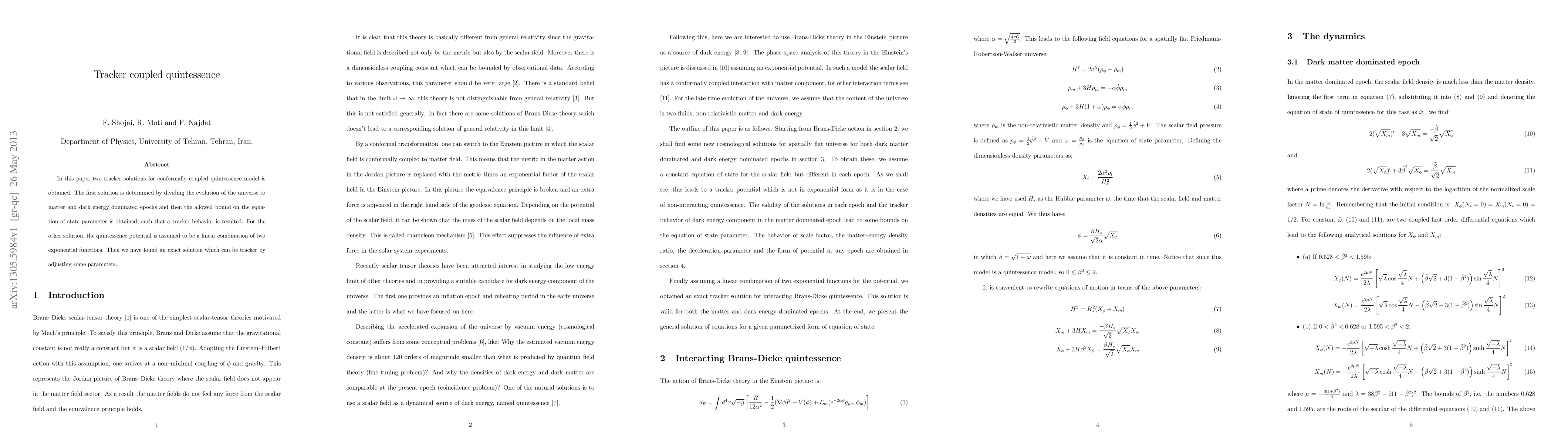 This paper explores two tracker solutions for a conformally coupled quintessence model, determining bounds on the equation of state for one and finding an exact solution for the other by using a linear combination of exponential functions. Both solutions aim to achieve a tracker behavior in the universe's evolution.
