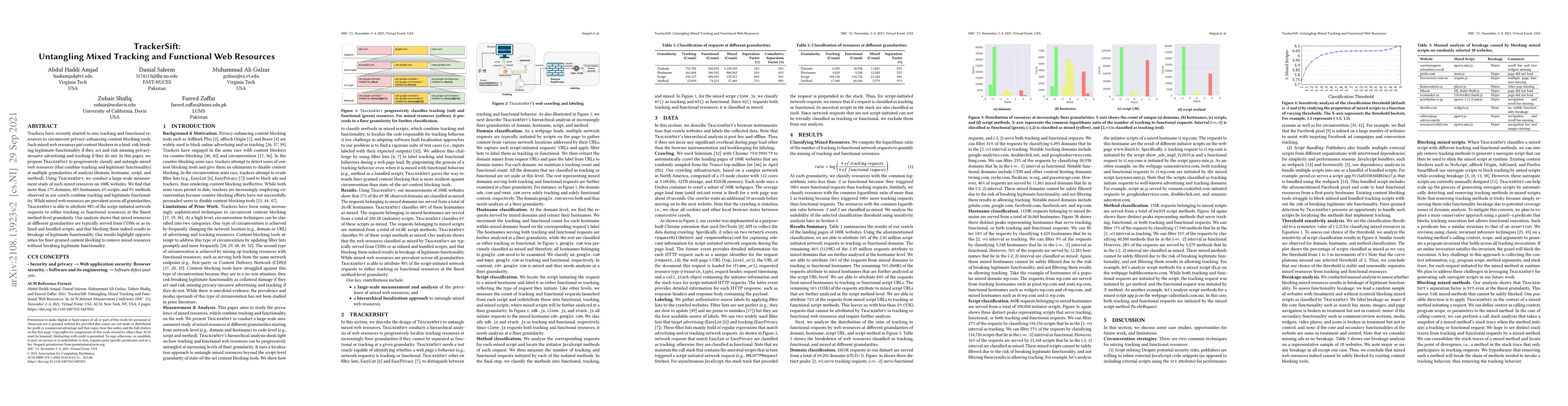 TrackerSift proposes a method to classify and separate mixed web resources that combine tracking and functional elements, enabling more precise content blocking. The study reveals that over 17% of domains, 48% of hostnames, 6% of scripts, and 9% of methods mix tracking and legitimate functionality, while TrackerSift can attribute 98% of network requests to either category at the method level.