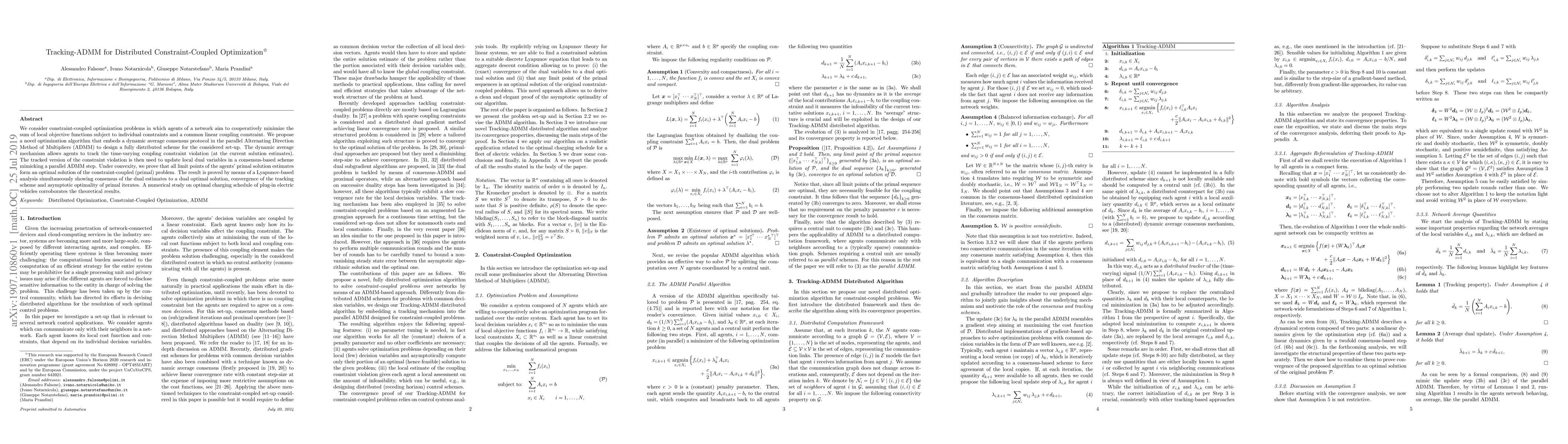 We consider constraint-coupled optimization problems in which agents of a network aim to cooperatively minimize the sum of local objective functions subject to individual constraints and a common linear coupling constraint. We propose a novel optimization algorithm that embeds a dynamic average consensus protocol in the parallel Alternating Direction Method of Multipliers (ADMM) to design a fully distributed scheme for the considered set-up. The dynamic average mechanism allows agents to track the time-varying coupling constraint violation (at the current solution estimates). The tracked version of the constraint violation is then used to update local dual variables in a consensus-based scheme mimicking a parallel ADMM step. Under convexity, we prove that all limit points of the agents' primal solution estimates form an optimal solution of the constraint-coupled (primal) problem. The result is proved by means of a Lyapunov-based analysis simultaneously showing consensus of the dual estimates to a dual optimal solution, convergence of the tracking scheme and asymptotic optimality of primal iterates. A numerical study on optimal charging schedule of plug-in electric vehicles corroborates the theoretical results.