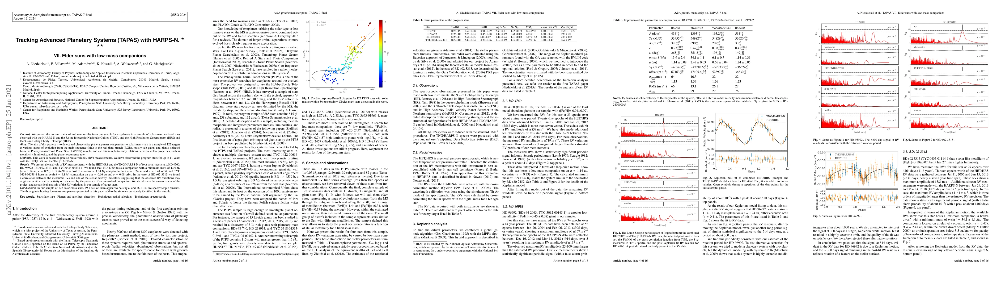 The TAPAS project uses HARPS-N and other telescopes to search for exoplanets around evolved solar-mass stars. The study identified potential companions around four stars, including a 13.9 MJ planet around HD 4760, while RV variations in BD+02 3313 may indicate stellar activity or an unresolved companion.