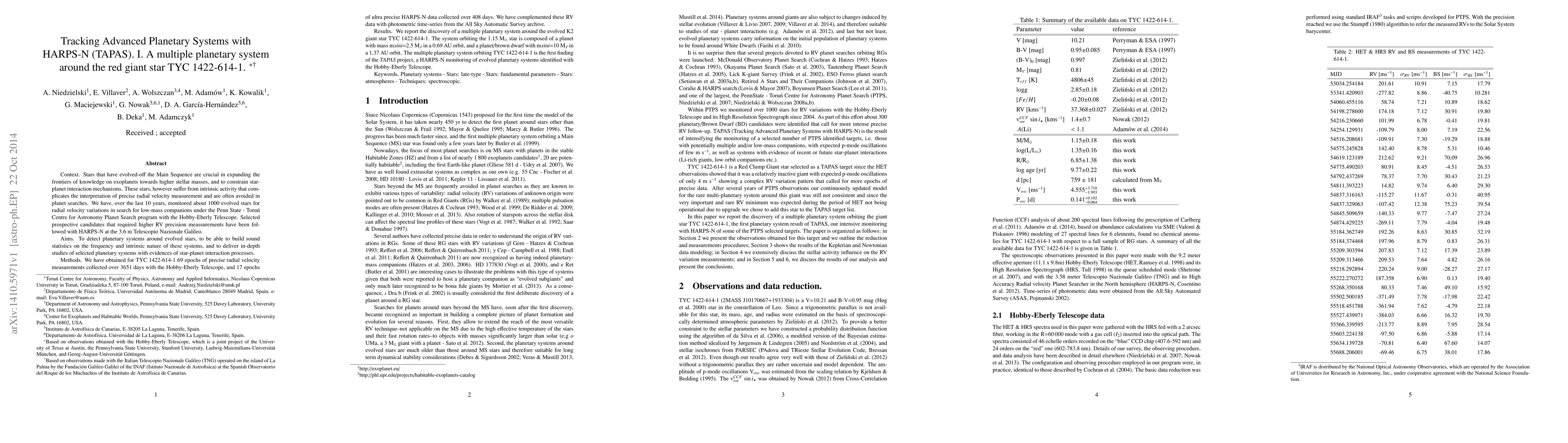 The TAPAS project discovered a multiple planetary system around the evolved K2 giant star TYC 1422-614-1, comprising a planet with 2.5 M$_J$ in a 0.69 AU orbit and a planet/brown dwarf with 10 M$_J$ in a 1.37 AU orbit, using precise radial velocity measurements from HARPS-N and the Hobby-Eberly Telescope. This finding highlights the potential of evolved stars to host complex planetary systems.