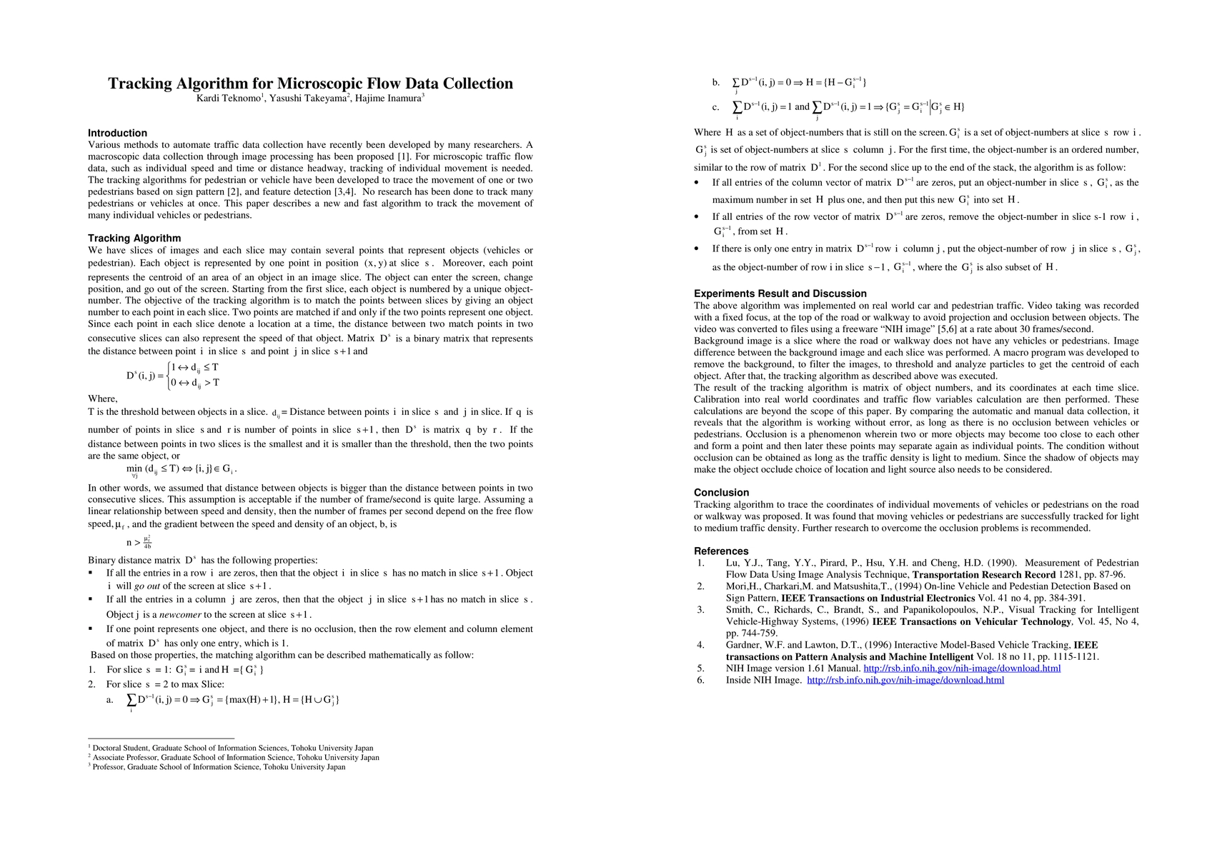 Various methods to automate traffic data collection have recently been developed by many researchers. A macroscopic data collection through image processing has been proposed. For microscopic traffic flow data, such as individual speed and time or distance headway, tracking of individual movement is needed. The tracking algorithms for pedestrian or vehicle have been developed to trace the movement of one or two pedestrians based on sign pattern, and feature detection. No research has been done to track many pedestrians or vehicles at once. This paper describes a new and fast algorithm to track the movement of many individual vehicles or pedestrians