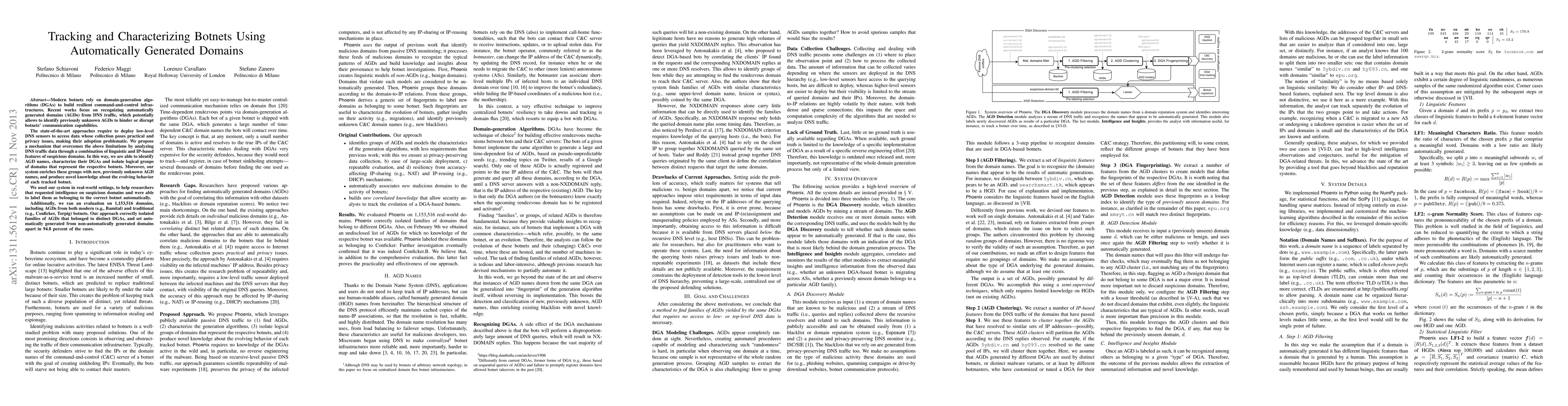 This paper proposes a novel mechanism to track and characterize botnets by analyzing automatically generated domains (AGDs) using linguistic and IP-based features, without requiring low-level DNS sensors. The system successfully identifies AGDs, characterizes their domain-generation algorithms, and isolates botnets, achieving 94.8% accuracy in distinguishing AGDs from non-AGDs.