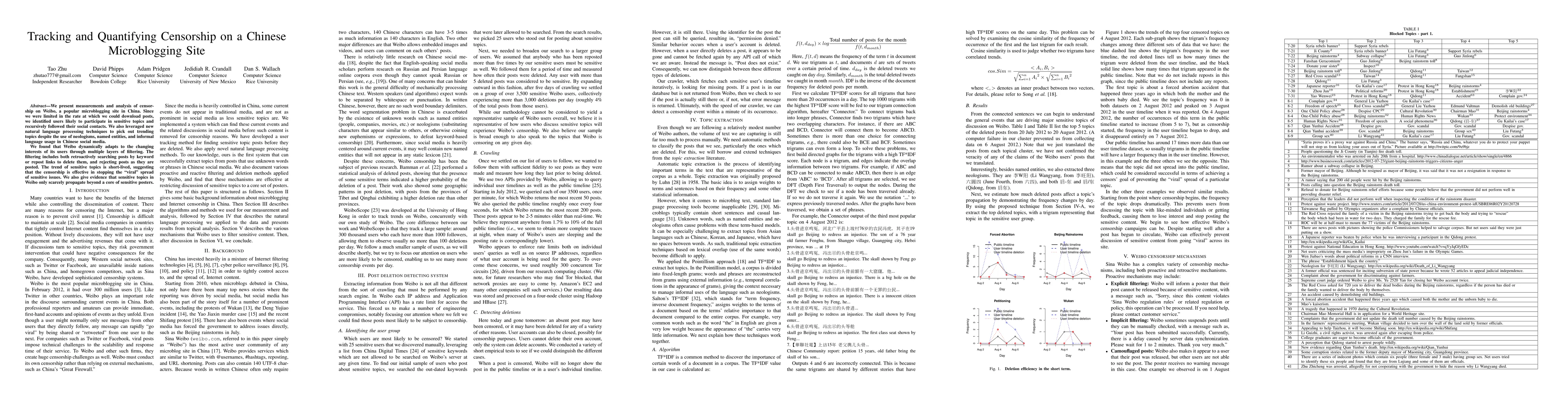 This study measures and analyzes censorship on Weibo, revealing dynamic filtering methods that include both retroactive deletion and real-time post rejection. Sensitive topics are quickly suppressed, indicating effective censorship that limits their spread beyond a core group.