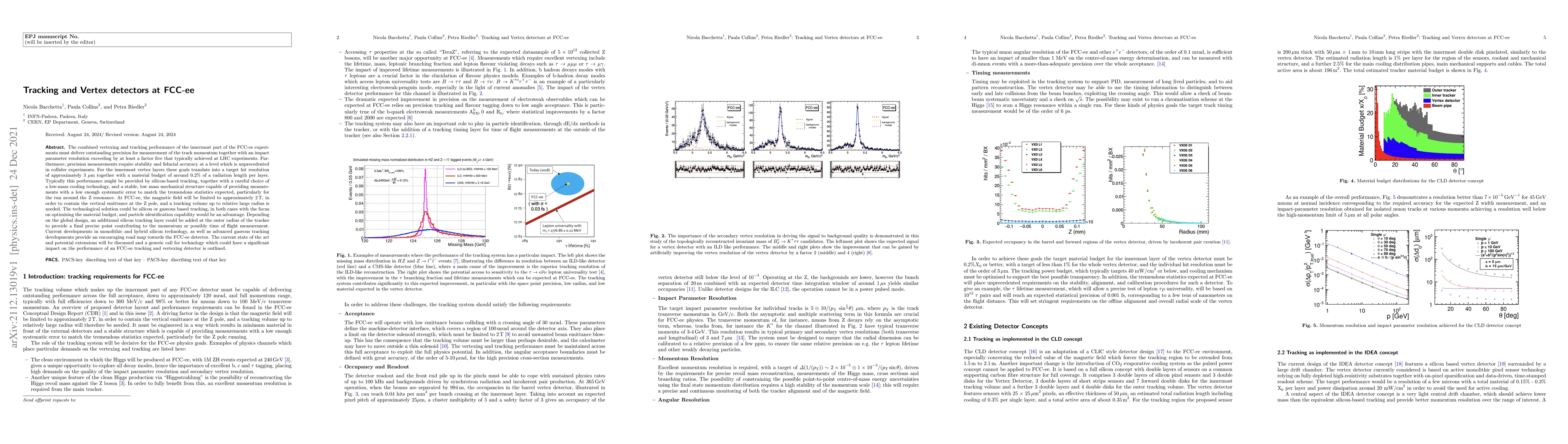 The paper discusses the design and performance requirements for the innermost vertex and tracking detectors at FCC-ee, aiming for precision beyond current LHC standards, with a target hit resolution of 3 µm and a material budget of 0.2% per layer. The focus is on silicon or gaseous tracking technologies to achieve these goals, with advancements in silicon and gaseous tracking technologies offering promising solutions.