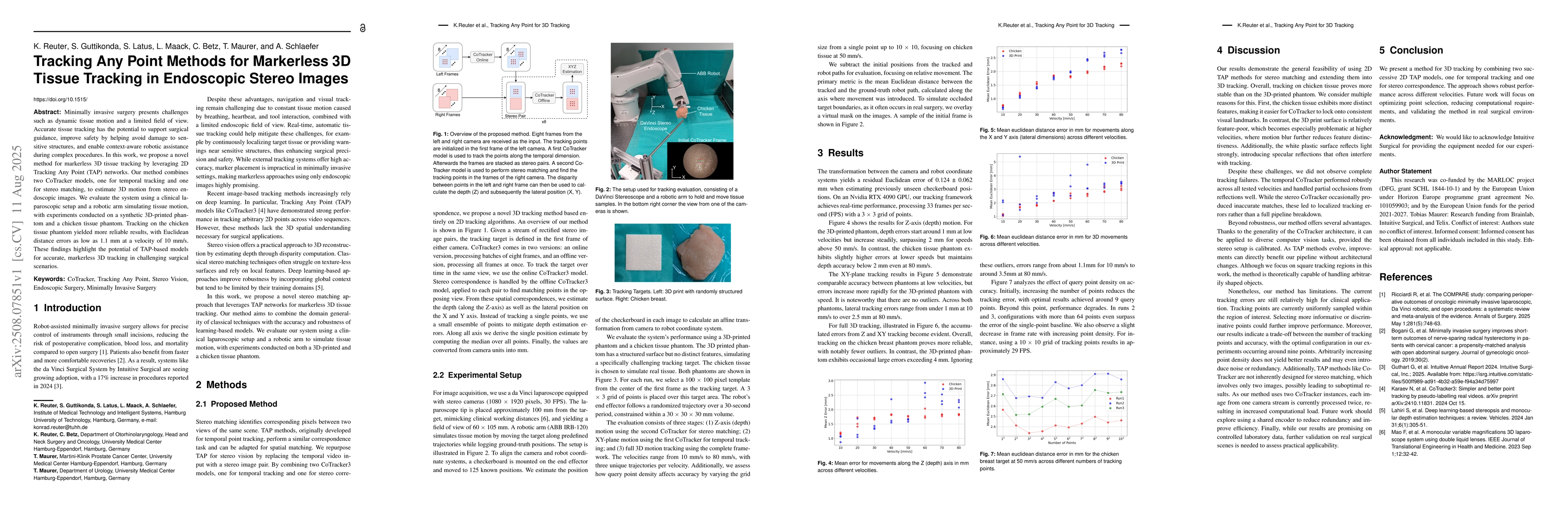 The research proposes a novel method for markerless 3D tissue tracking in endoscopic stereo images by combining two CoTracker models, one for temporal tracking and another for stereo matching, to estimate 3D motion from stereo endoscopic images.