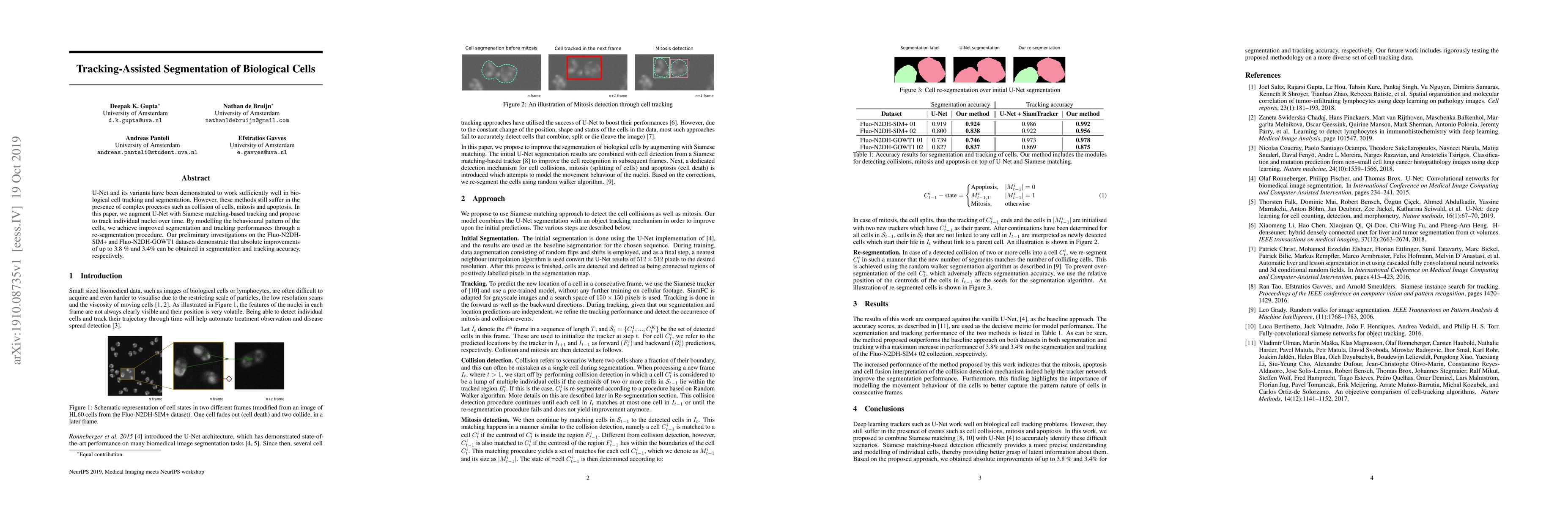 A new method for tracking biological cells combines U-Net with Siamese matching-based tracking to improve segmentation accuracy up to 3.8%. This approach models cell behavior over time for better tracking performance.