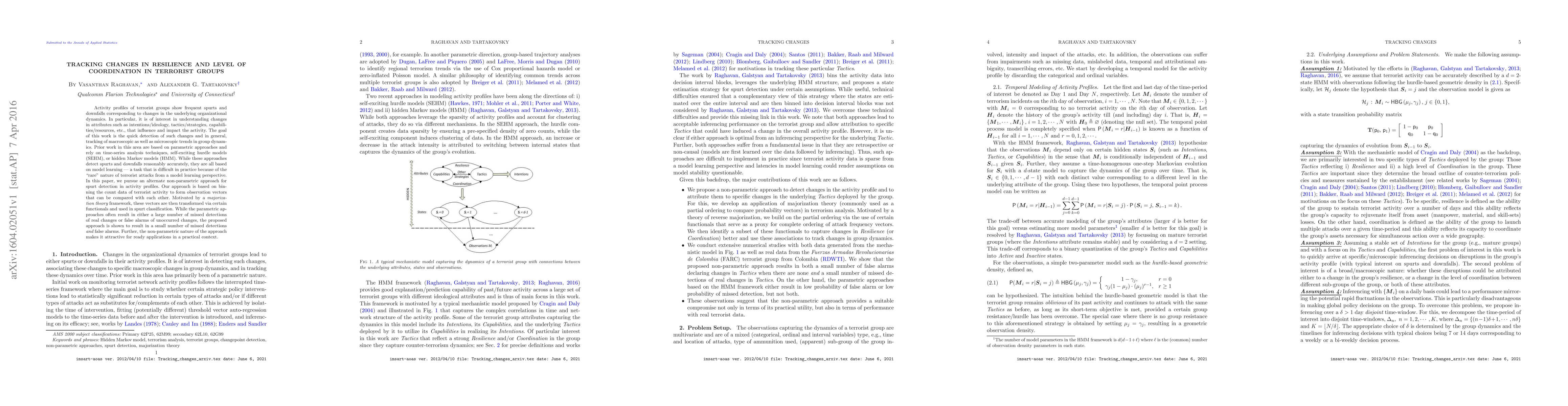 This paper proposes a non-parametric method for detecting changes in terrorist group activity profiles, focusing on tracking shifts in resilience and coordination. Unlike previous parametric models, this method bins activity count data and uses functional transformation for spurt detection, resulting in fewer missed detections and false alarms, making it more practical for real-world applications.