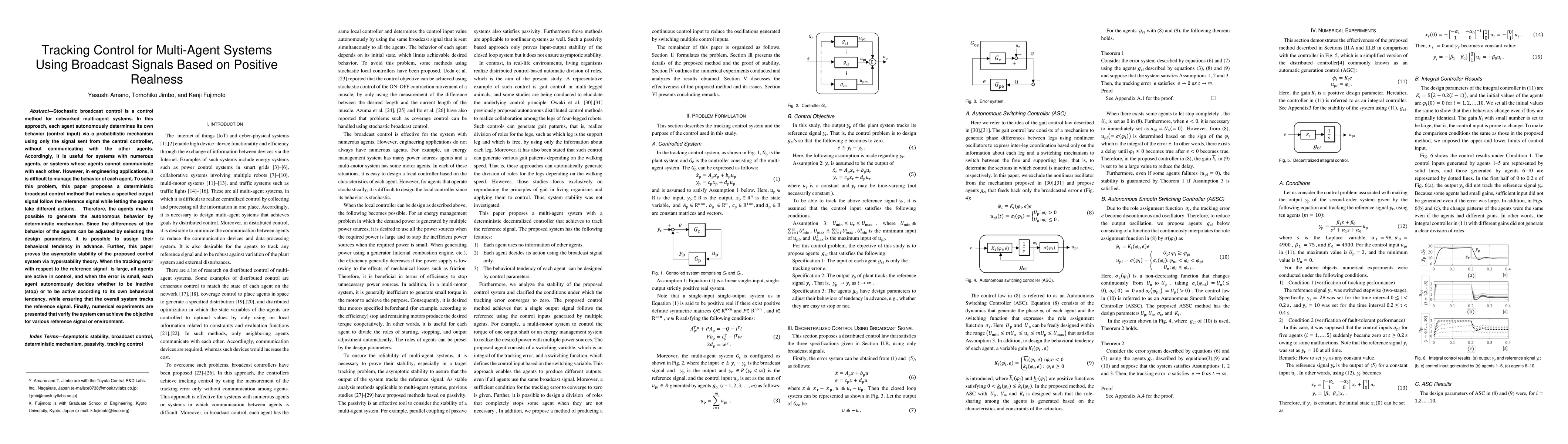 Broadcast control is one of decentralized control methods for networked multi-agent systems. In this method, each agent does not communicate with the others, and autonomously determines its own action using only the same signal sent from a central controller. Therefore, it is effective for systems with numerous agents or no-communication between agents. However, it is difficult to manage the stochastic action process of agents considering engineering applications. This paper proposes a decentralized control such that agents autonomously select the deterministic actions. Firstly, a non-linear controller with a binary output of each agent including 0 is introduced in order to express stop actions autonomously when the target is achieved. The asymptotic stability to the target is proved. Secondly, the controller can adjust the tendency of actions in order to make it easier to manage the actions. Thirdly, the controller is extended to that with a continuous output in order to reduce the tracking error to the target and the output vibration. Finally, the effectiveness of the proposed control is verified by numerical experiments.