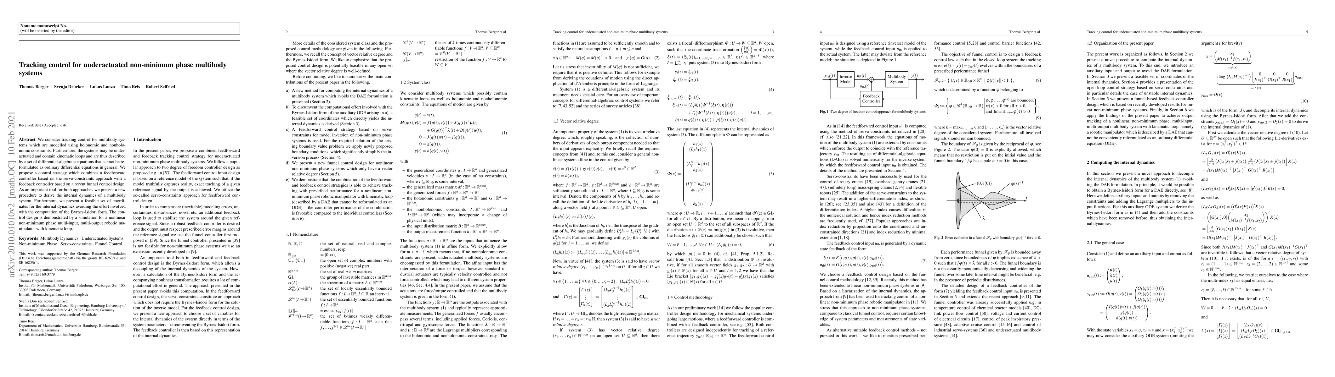 We consider tracking control for multibody systems which are modelled using holonomic and nonholonomic constraints. Furthermore, the systems may be underactuated and contain kinematic loops and are thus described by a set of differential-algebraic equations that cannot be reformulated as ordinary differential equations in general. We propose a control strategy which combines a feedforward controller based on the servo-constraints approach with a feedback controller based on a recent funnel control design. As an important tool for both approaches we present a new procedure to derive the internal dynamics of a multibody system. Furthermore, we present a feasible set of coordinates for the internal dynamics avoiding the effort involved with the computation of the Byrnes-Isidori form. The control design is demonstrated by a simulation for a nonlinear non-minimum phase multi-input, multi-output robotic manipulator with kinematic loop.