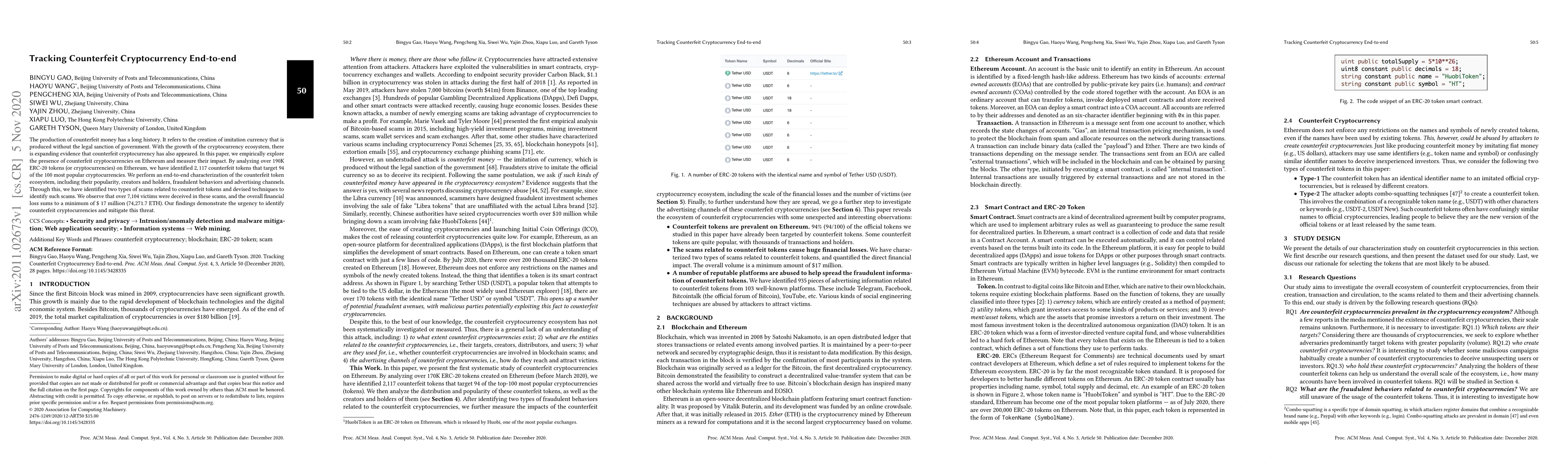 The production of counterfeit money has a long history. It refers to the creation of imitation currency that is produced without the legal sanction of government. With the growth of the cryptocurrency ecosystem, there is expanding evidence that counterfeit cryptocurrency has also appeared. In this paper, we empirically explore the presence of counterfeit cryptocurrencies on Ethereum and measure their impact. By analyzing over 190K ERC-20 tokens (or cryptocurrencies) on Ethereum, we have identified 2, 117 counterfeit tokens that target 94 of the 100 most popular cryptocurrencies. We perform an end-to-end characterization of the counterfeit token ecosystem, including their popularity, creators and holders, fraudulent behaviors and advertising channels. Through this, we have identified two types of scams related to counterfeit tokens and devised techniques to identify such scams. We observe that over 7,104 victims were deceived in these scams, and the overall financial loss sums to a minimum of $ 17 million (74,271.7 ETH). Our findings demonstrate the urgency to identify counterfeit cryptocurrencies and mitigate this threat.