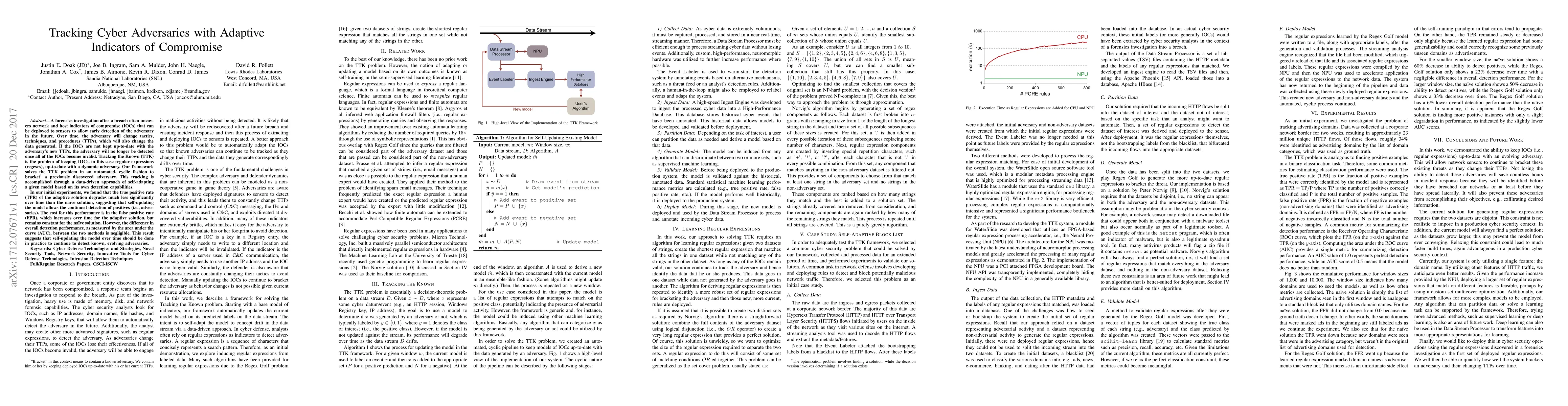 A forensics investigation after a breach often uncovers network and host indicators of compromise (IOCs) that can be deployed to sensors to allow early detection of the adversary in the future. Over time, the adversary will change tactics, techniques, and procedures (TTPs), which will also change the data generated. If the IOCs are not kept up-to-date with the adversary's new TTPs, the adversary will no longer be detected once all of the IOCs become invalid. Tracking the Known (TTK) is the problem of keeping IOCs, in this case regular expressions (regexes), up-to-date with a dynamic adversary. Our framework solves the TTK problem in an automated, cyclic fashion to bracket a previously discovered adversary. This tracking is accomplished through a data-driven approach of self-adapting a given model based on its own detection capabilities. In our initial experiments, we found that the true positive rate (TPR) of the adaptive solution degrades much less significantly over time than the naive solution, suggesting that self-updating the model allows the continued detection of positives (i.e., adversaries). The cost for this performance is in the false positive rate (FPR), which increases over time for the adaptive solution, but remains constant for the naive solution. However, the difference in overall detection performance, as measured by the area under the curve (AUC), between the two methods is negligible. This result suggests that self-updating the model over time should be done in practice to continue to detect known, evolving adversaries.